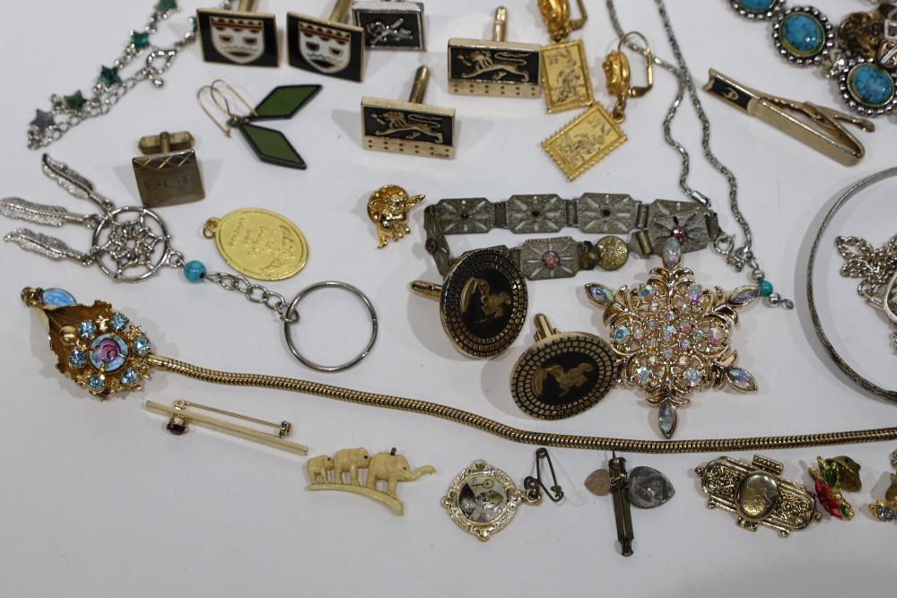 Costume Jewelry Items Including Necklaces, Brooches, Bracelets, and Earrings. Includes a variety of necklaces, bracelets with turquoise accents, intricate brooches, cufflinks, chains, and ornate earrings. Elements such as cameos, animal motifs, religious pendants, and assorted charms are present. Some items are stored in display boxes, while others include tags.