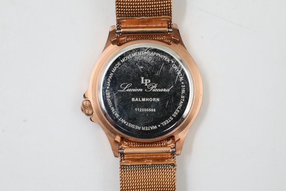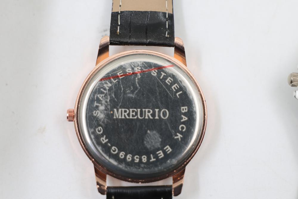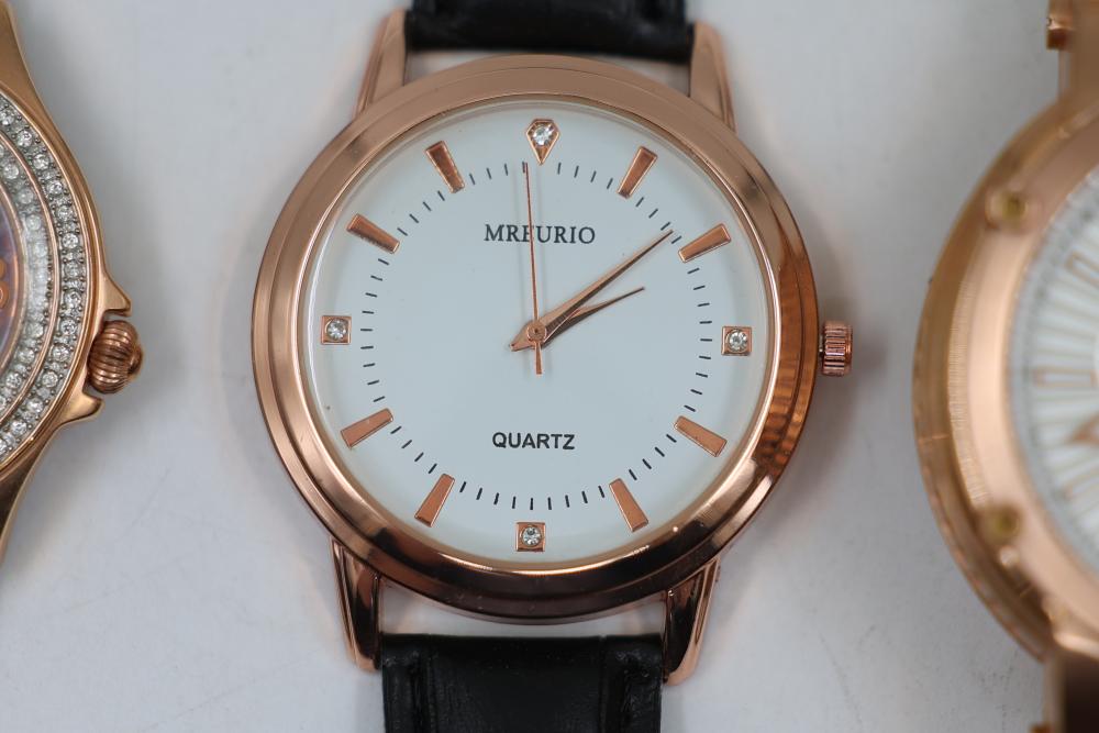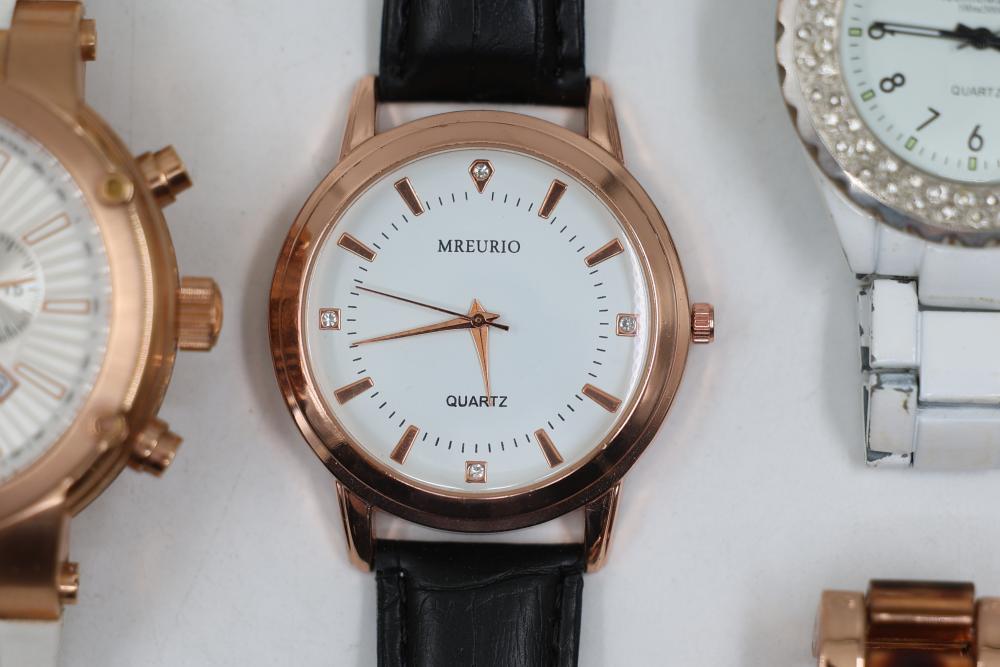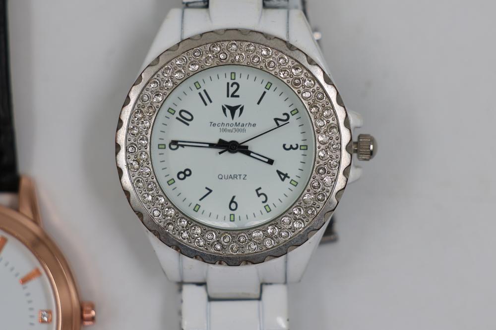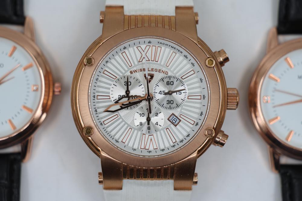 Wrist watches incl "Swiss Legend" with silicone band ser# 110004417, "Lucien Piccard" with metal band ser# 112000566, "TechnoMarhe" with metal band, "Geneve" No. 6893 with metal band, also incl two "Mreurio".