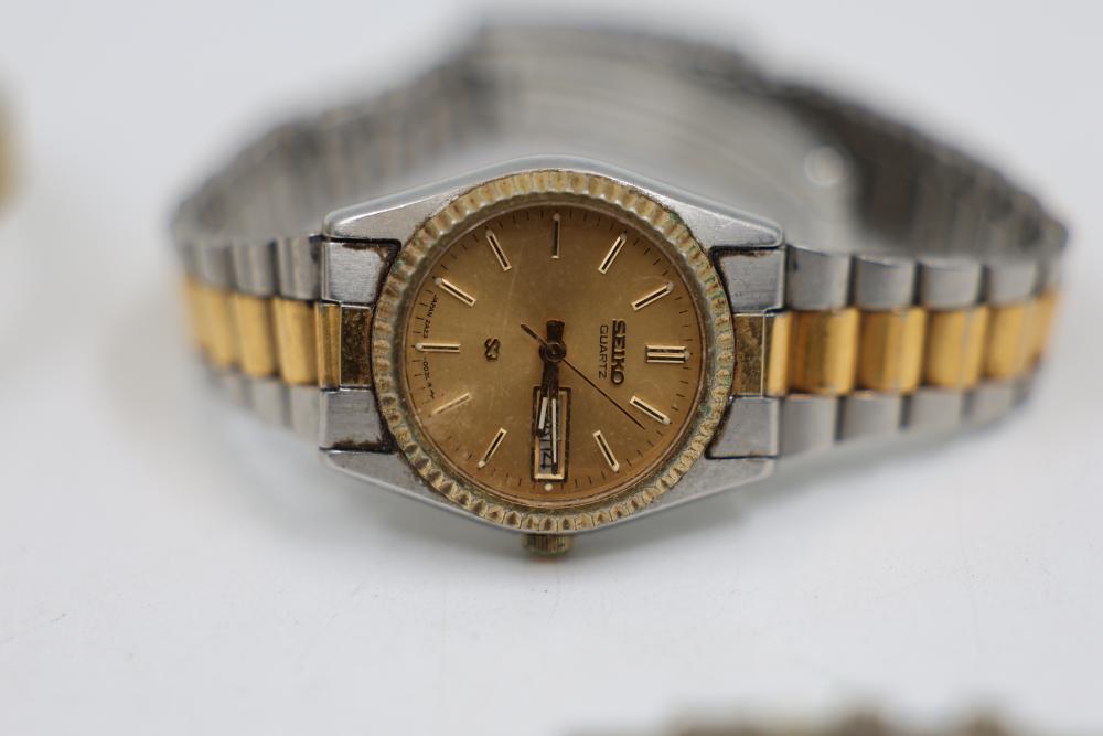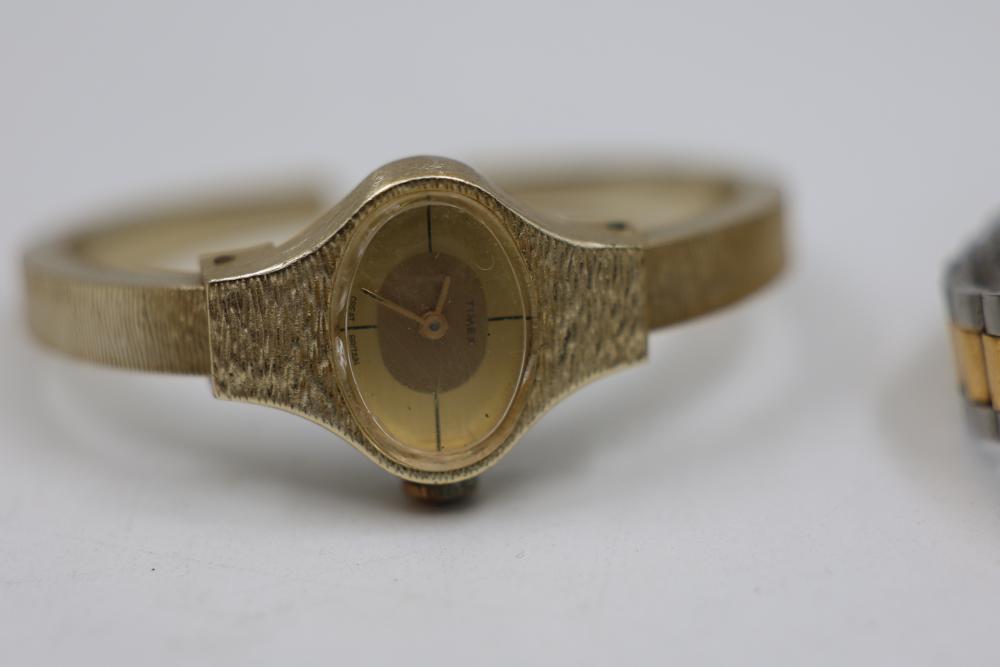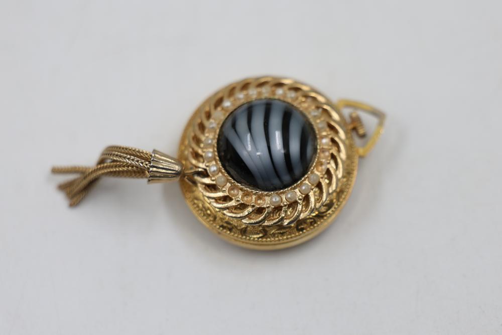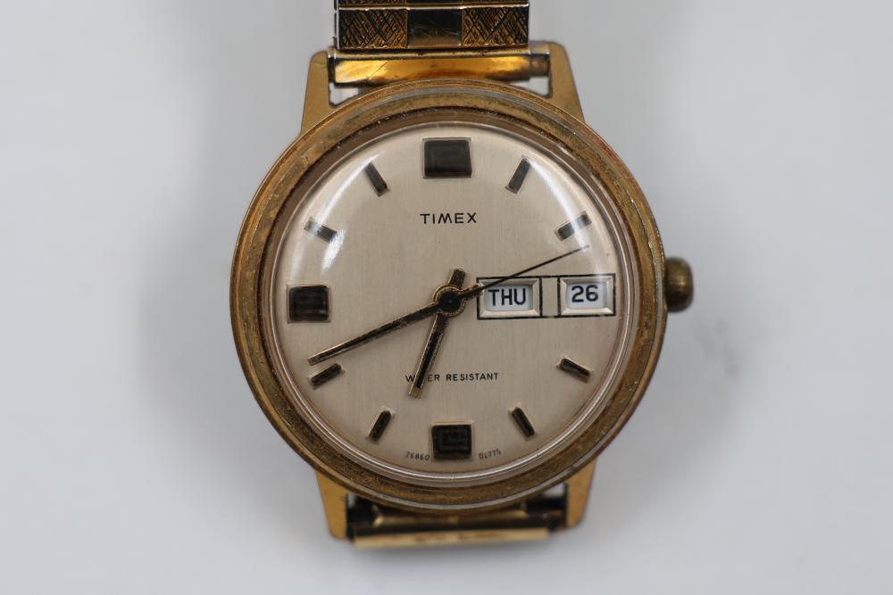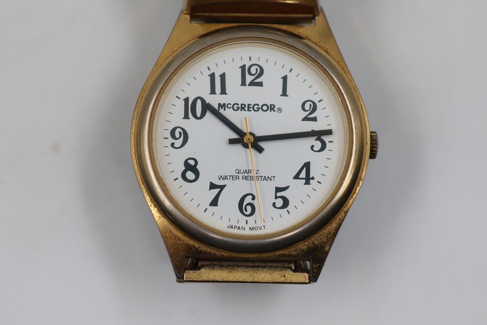 Five Wristwatches including Timex, McGregor, and other brands with metal and leather straps, a circular pendant with a striped stone insert, and a metal lighter case.