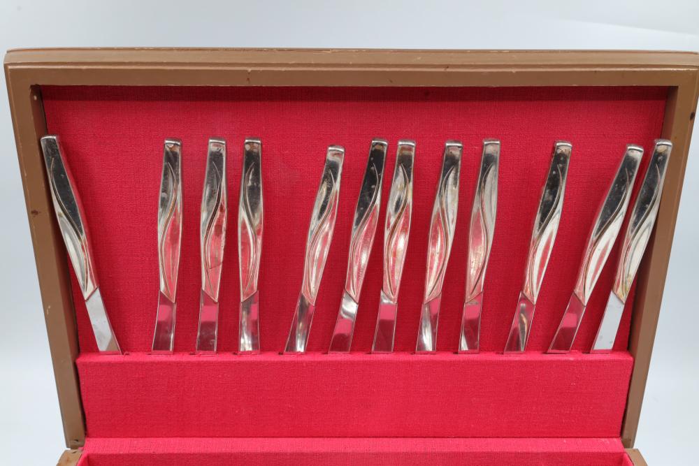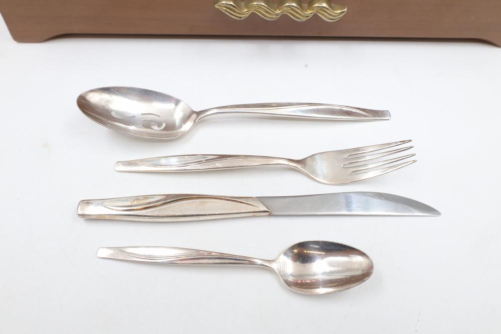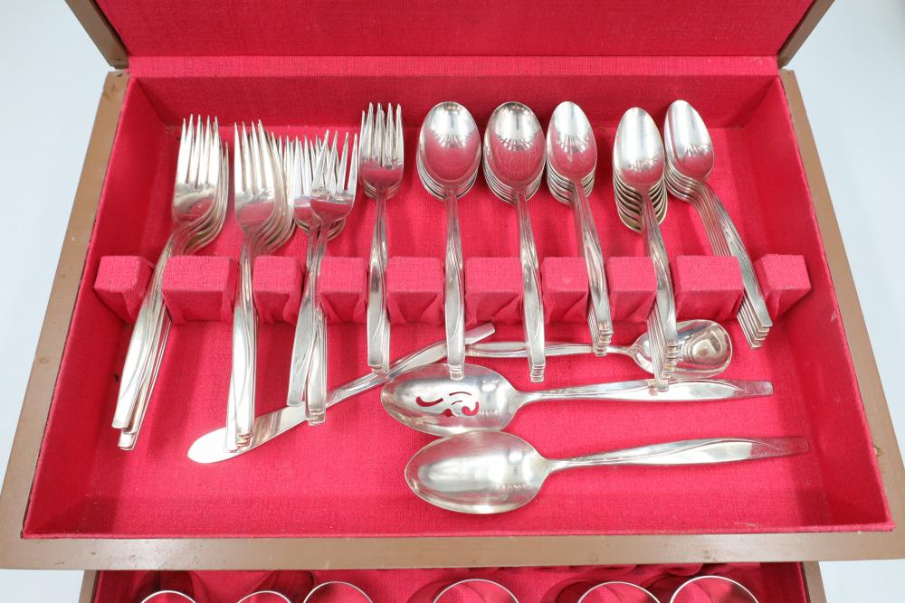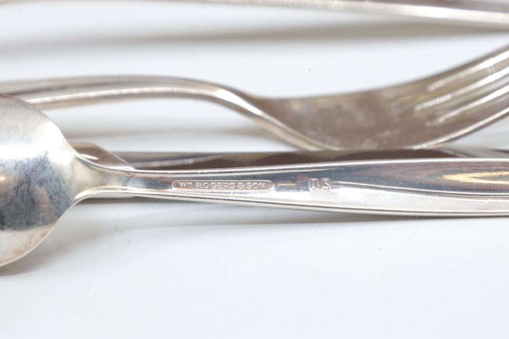 Flatware set marked "WM. Rogers & Son IS", service for 12 incl forks, spoons, knives, and silver plate napkin rings. Total weight of items being 1,968 grams not incl knives. Total weight of knives being 636 grams total.