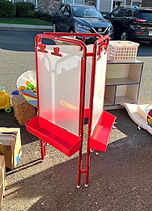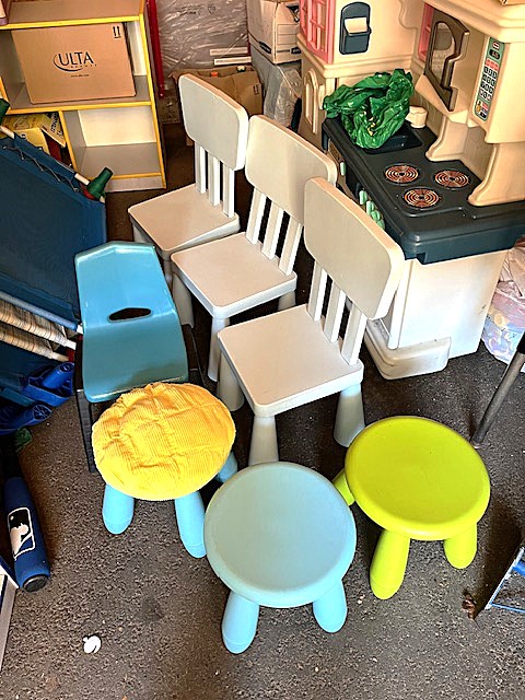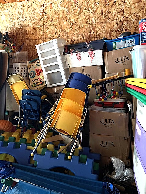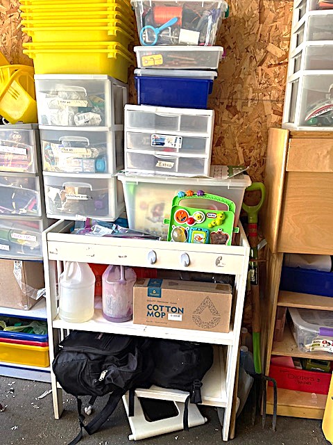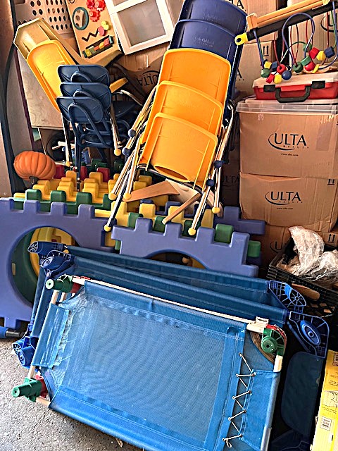 Contents of two 19' x 12' garages being sold by the garage's owner. Items are being liquidated from a closed daycare. Contents include: Joni cabinets, foldable cribs with posture boards; wooden rolling storage cart; Little Tikes tricycles; Bye Bye Buggy six-seater stroller; Joni Craft wooden sensory play kitchen; Graco Ingenuity high chairs; round exersaucers; wooden chairs; Graco baby rockers; Hewlett Packard desktop screen; sleeping cots; eight-seat kidney toddler feeding table; Little Tikes plastic kitchen; fine motor skills activity center; outside water interactive tables; three-sided easel- fine motor skill toys; soccer balls; bicycle helmets; Cosco Simple Fold high chairs; plus much more. The functionality of electric/electronic items are unknown. Authenticity is not checked nor guaranteed on any & all items. Items are located in Manchester, CT.