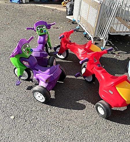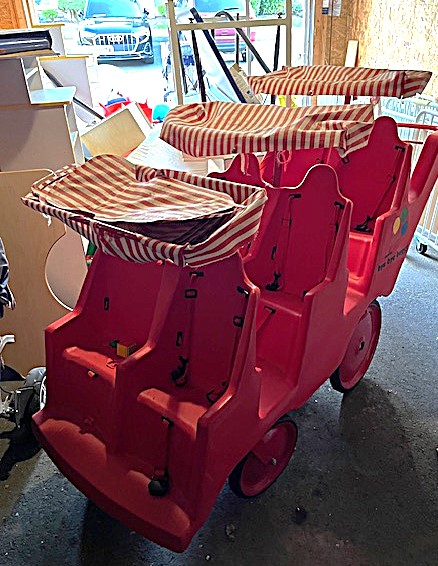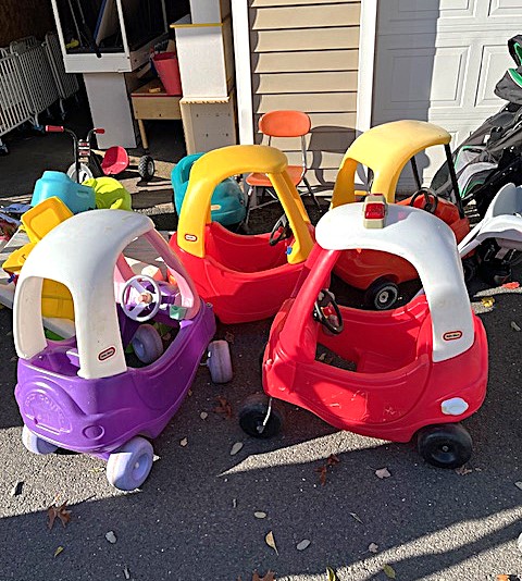 Contents of two 19' x 12' garages being sold by the garage's owner. Items are being liquidated from a closed daycare. Contents include: Joni cabinets, foldable cribs with posture boards; wooden rolling storage cart; Little Tikes tricycles; Bye Bye Buggy six-seater stroller; Joni Craft wooden sensory play kitchen; Graco Ingenuity high chairs; round exersaucers; wooden chairs; Graco baby rockers; Hewlett Packard desktop screen; sleeping cots; eight-seat kidney toddler feeding table; Little Tikes plastic kitchen; fine motor skills activity center; outside water interactive tables; three-sided easel- fine motor skill toys; soccer balls; bicycle helmets; Cosco Simple Fold high chairs; plus much more. The functionality of electric/electronic items are unknown. Authenticity is not checked nor guaranteed on any & all items. Items are located in Manchester, CT.