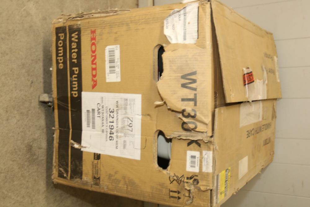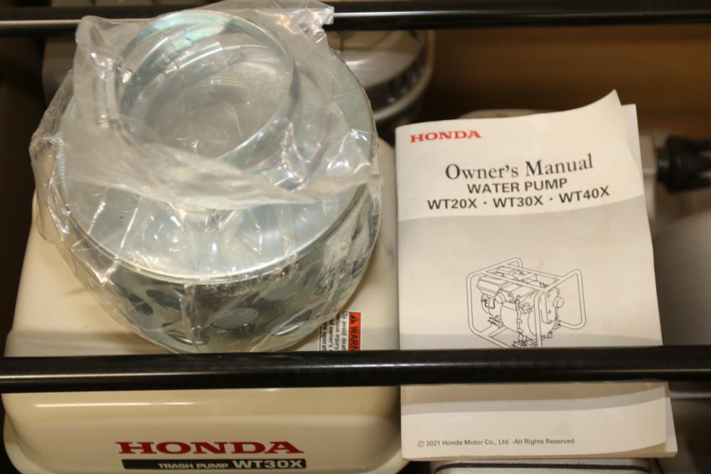 Honda WT30X 3 Inch Trash Pump with a 317 gallon per minute capacity, solid handling capability up to 11/16ths of an inch, and durable cast iron volute and impeller. Includes a quick clean-out port for maintenance efficiency. Model WT30XK4A. Item appears in original box with included owner's manual. Pickup only.