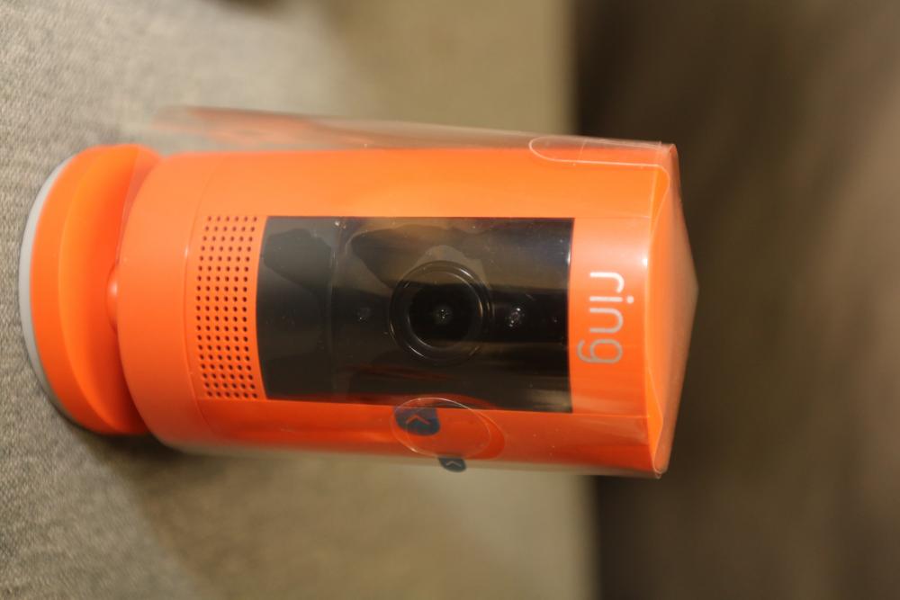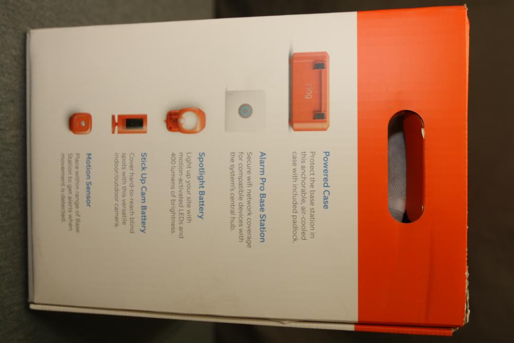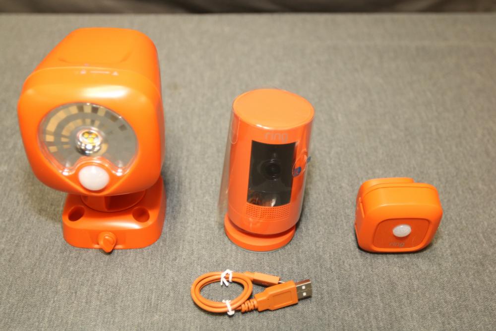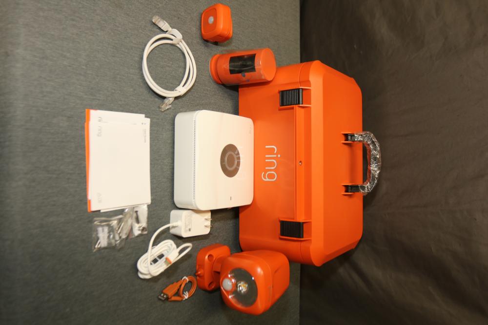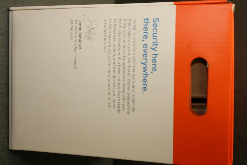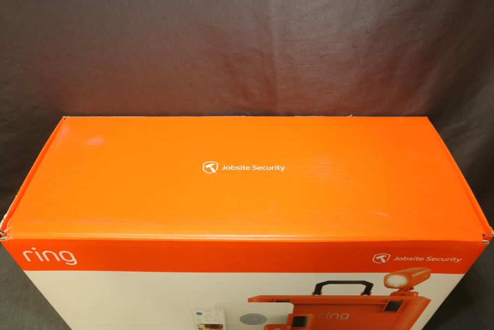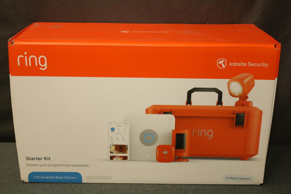 Ring Jobsite Security 5-Piece Starter Kit (Model B08S2Z5XK5). Includes powered case, Alarm Pro base station, spotlight battery, stick up cam battery, motion sensor, cables, and hardware. Designed for jobsite surveillance and security, this system is LTE-enabled and allows remote monitoring. Packaged in its original box with user guides and additional accessories. Pickup only.