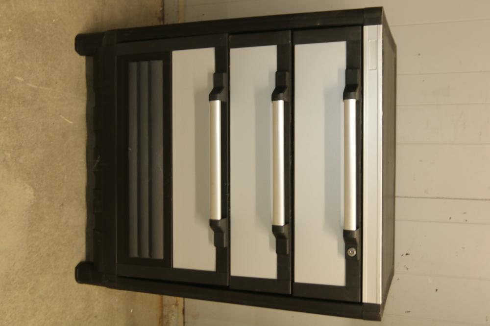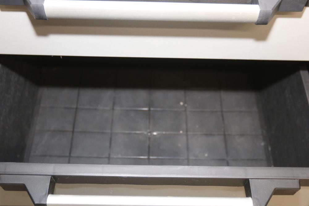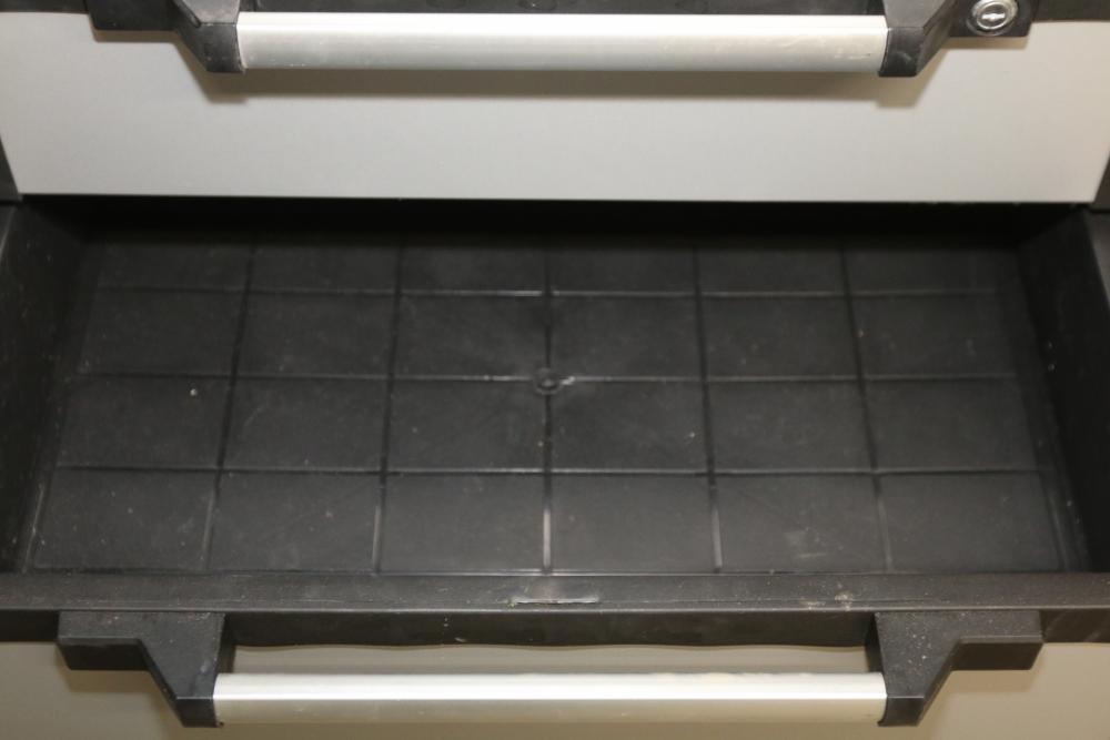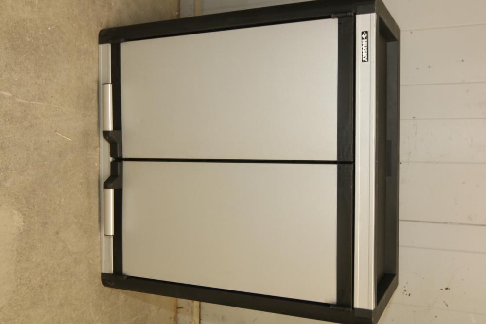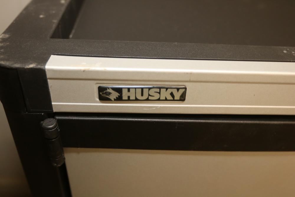 Husky 2-Drawer 29 inch wide garage storage cabinet with 2 hanging bins, featuring a small hole in the back. Includes a Husky 3-Drawer 29 inch wide garage storage cabinet with 4 legs; the key for the bottom drawer is not included. Both units feature spacious compartments and durable construction. Pickup only.
