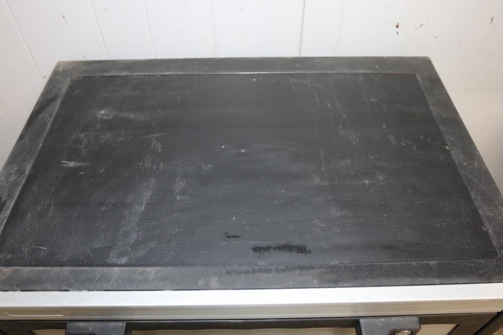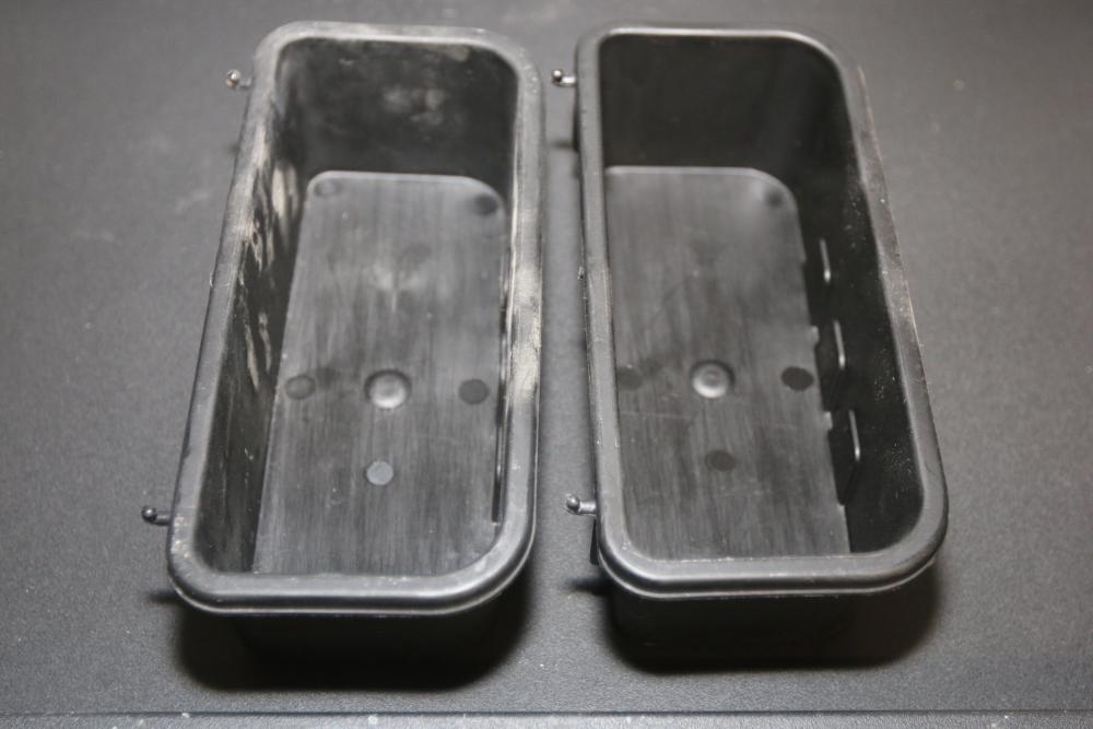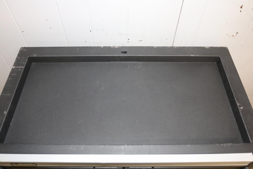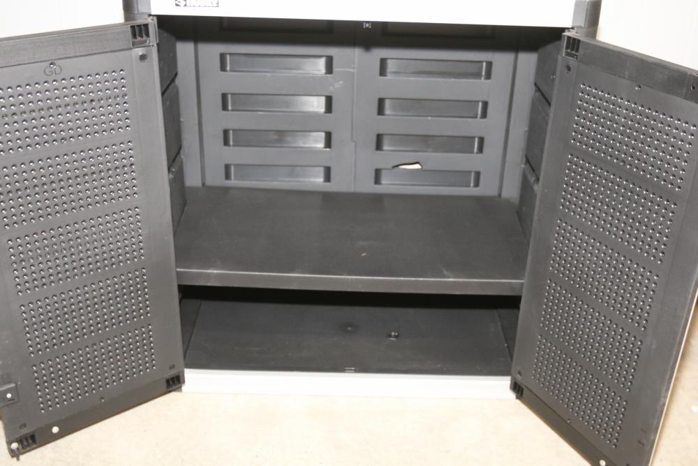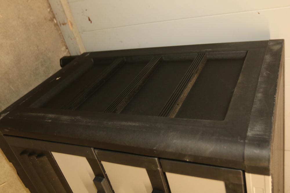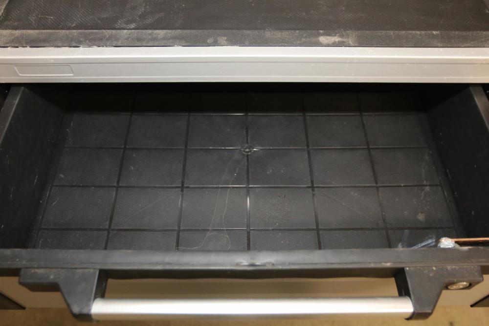 Husky 2-Drawer 29 inch wide garage storage cabinet with 2 hanging bins, featuring a small hole in the back. Includes a Husky 3-Drawer 29 inch wide garage storage cabinet with 4 legs; the key for the bottom drawer is not included. Both units feature spacious compartments and durable construction. Pickup only.