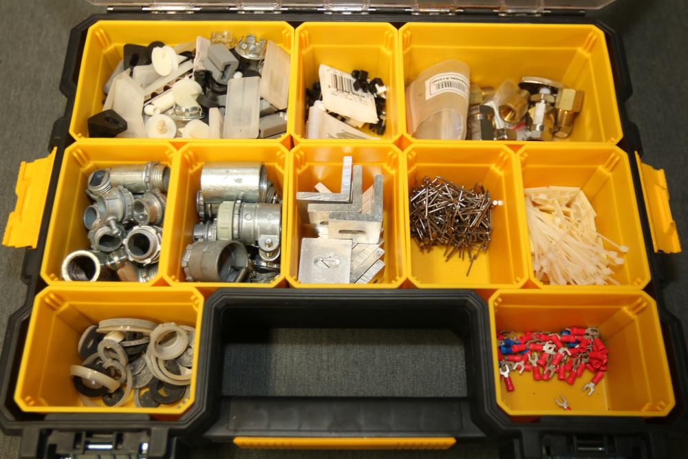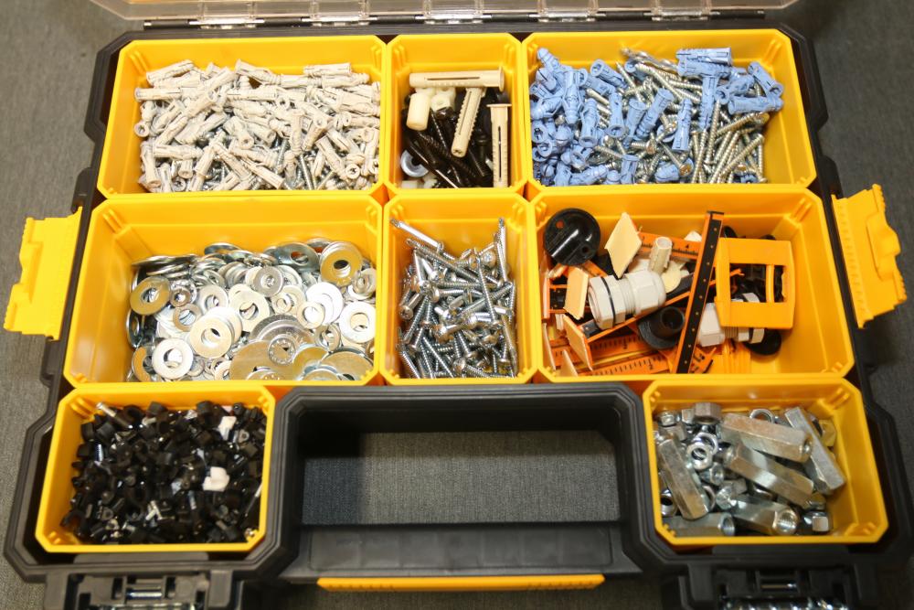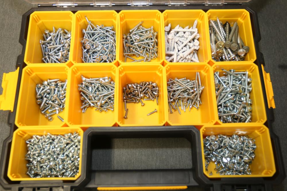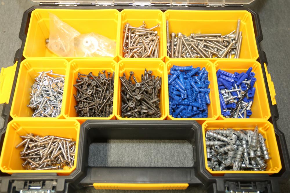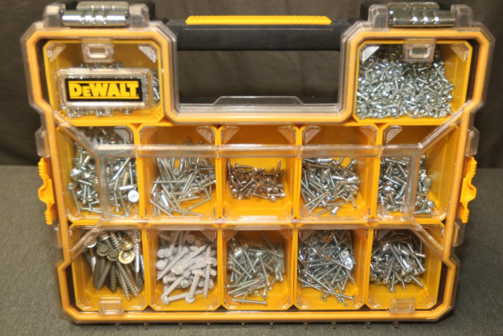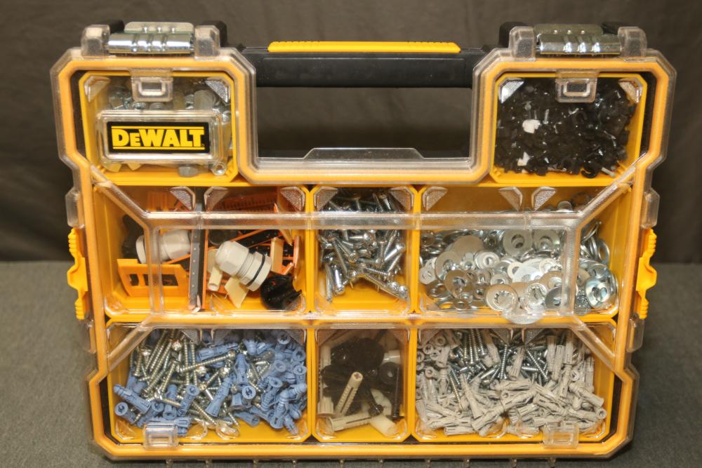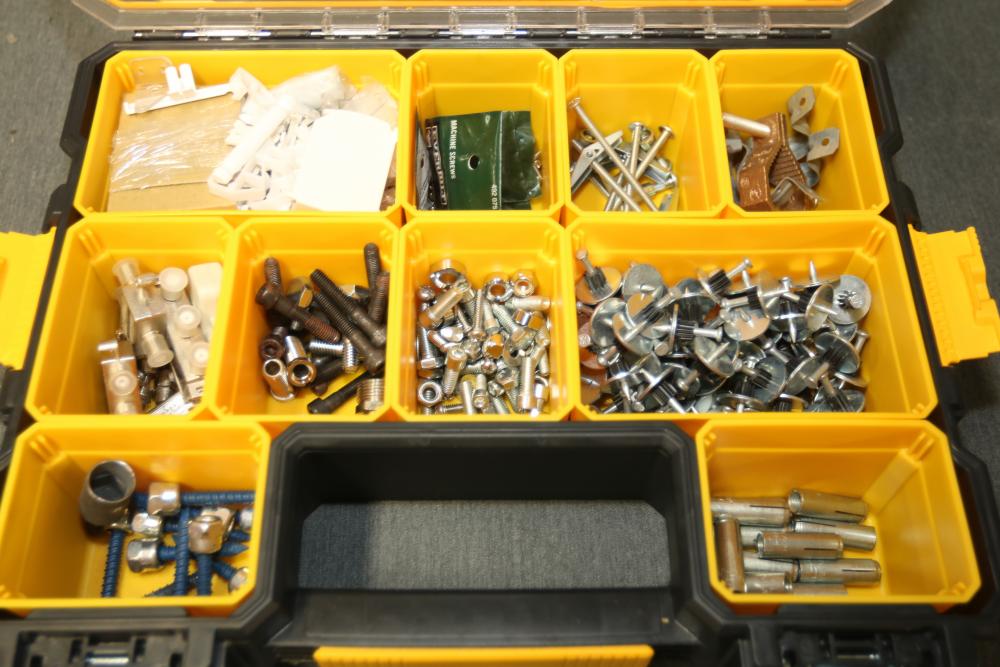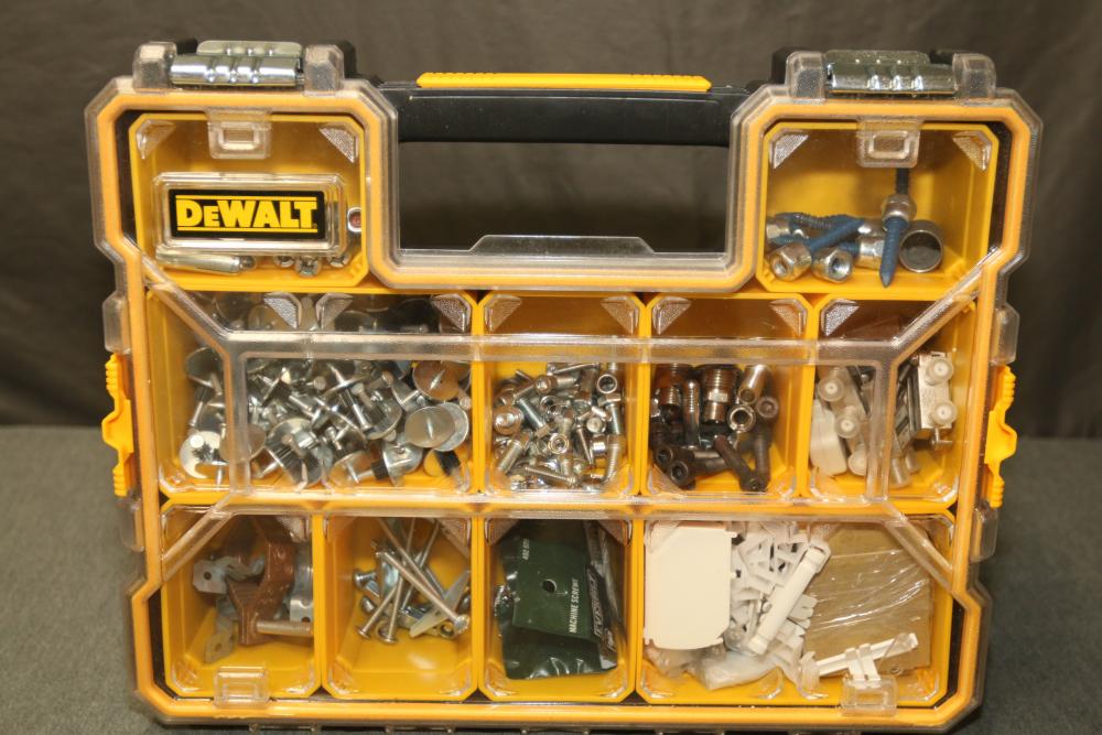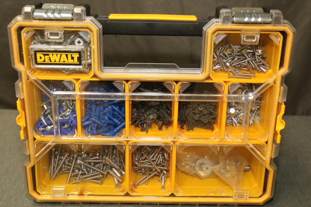 Quantity of 5 Dewalt Stackable Plastic Pro Small Parts Organizers with Various Hardware Accessories (Model DWST14825). One organizer contains 8 compartments, three organizers contain 10 compartments, and one organizer contains 12 compartments. Organizers are loaded with various hardware items as shown. Pickup only.