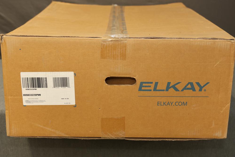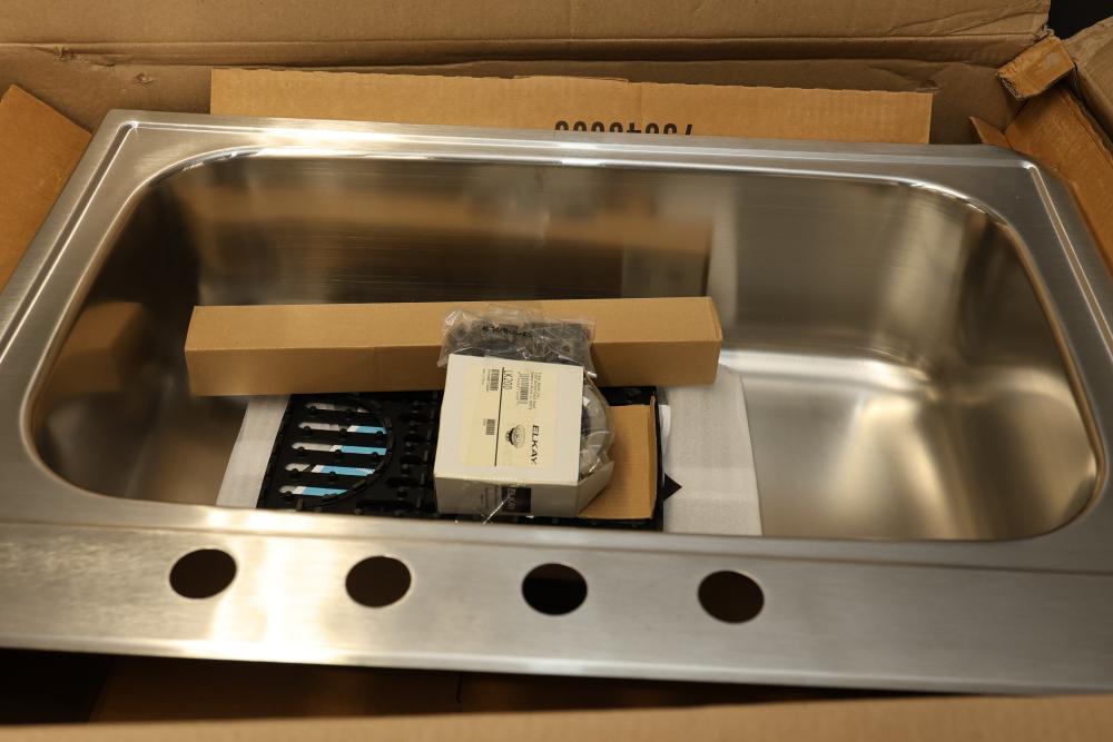 Elkay Parkway 33 Inch Drop-In Single Bowl 20 Gauge Stainless Steel Kitchen Sink Kit with Accessories (Model HDSB33229PWW). This kit includes a stainless steel sink with five faucet holes, a drain, a grid, a roll-up drying rack, and a matching bottom mat. Pickup only.