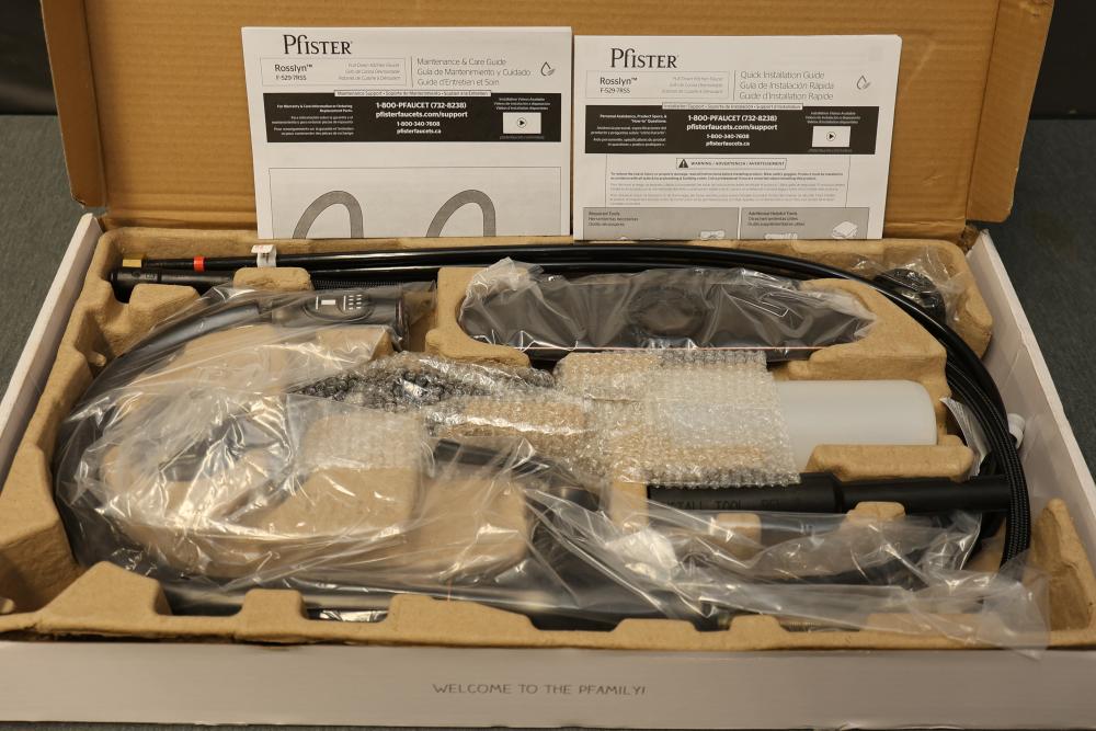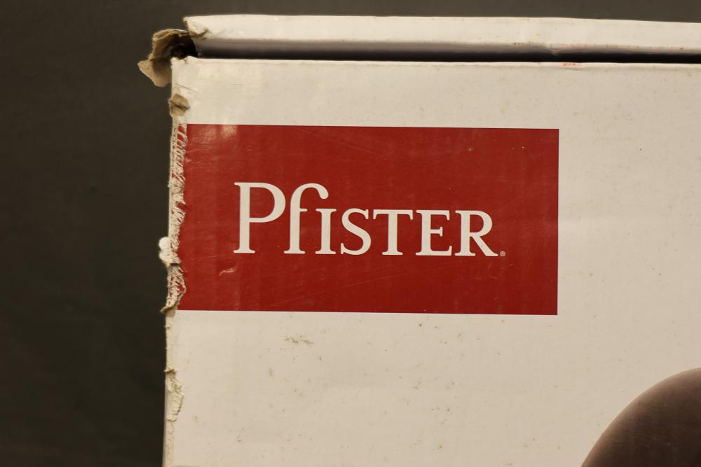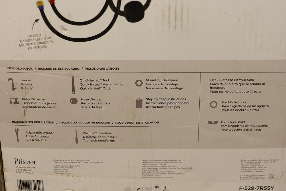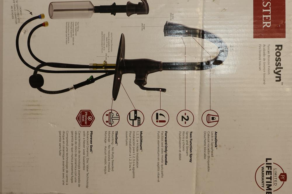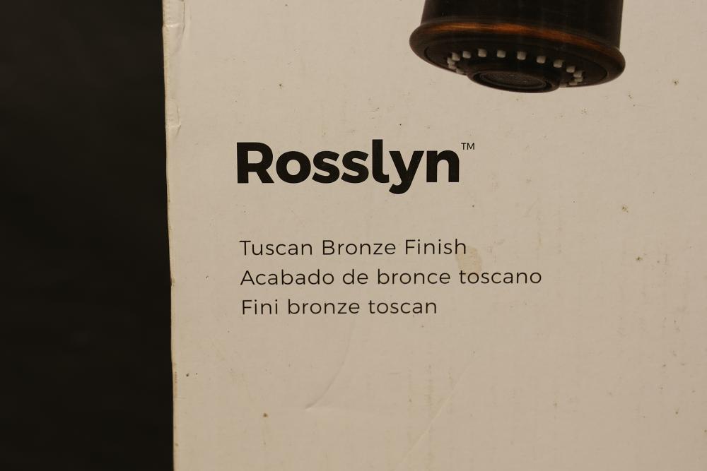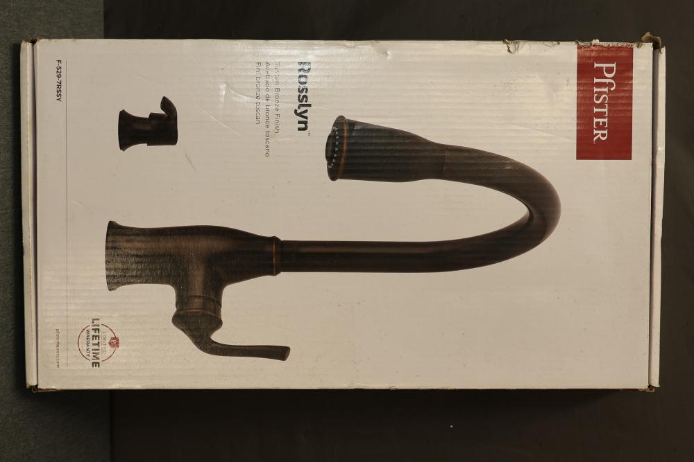 Pfister Rosslyn Single-Handle Pull-Down Sprayer Kitchen Faucet with Soap Dispenser in Tuscan Bronze (Model F-529-7RSSY). Features a durable Tuscan bronze finish, AccuDock secure docking, two function spray, forward-only handle for tight spaces, and a multipurpose soap dispenser. Includes mounting hardware and quick installation tools. Pickup only.
