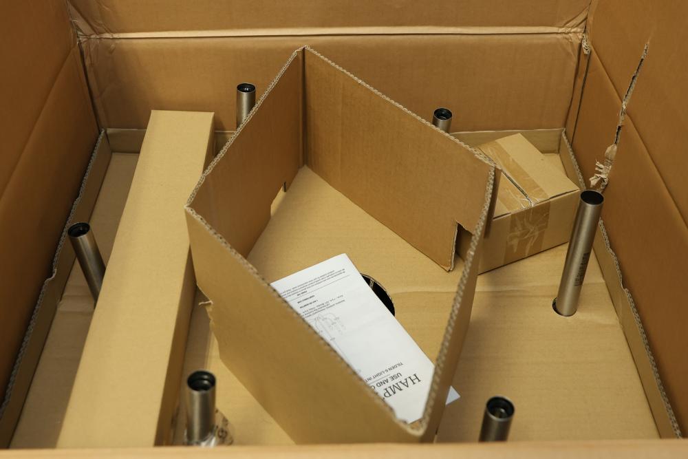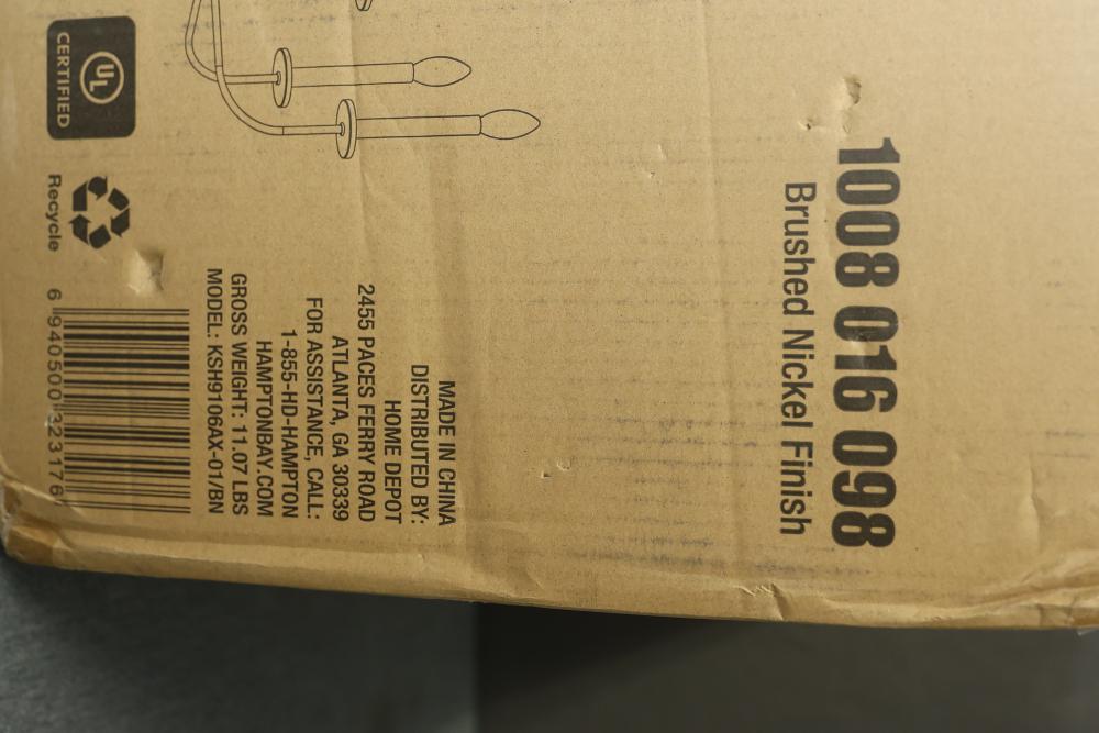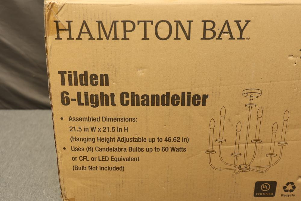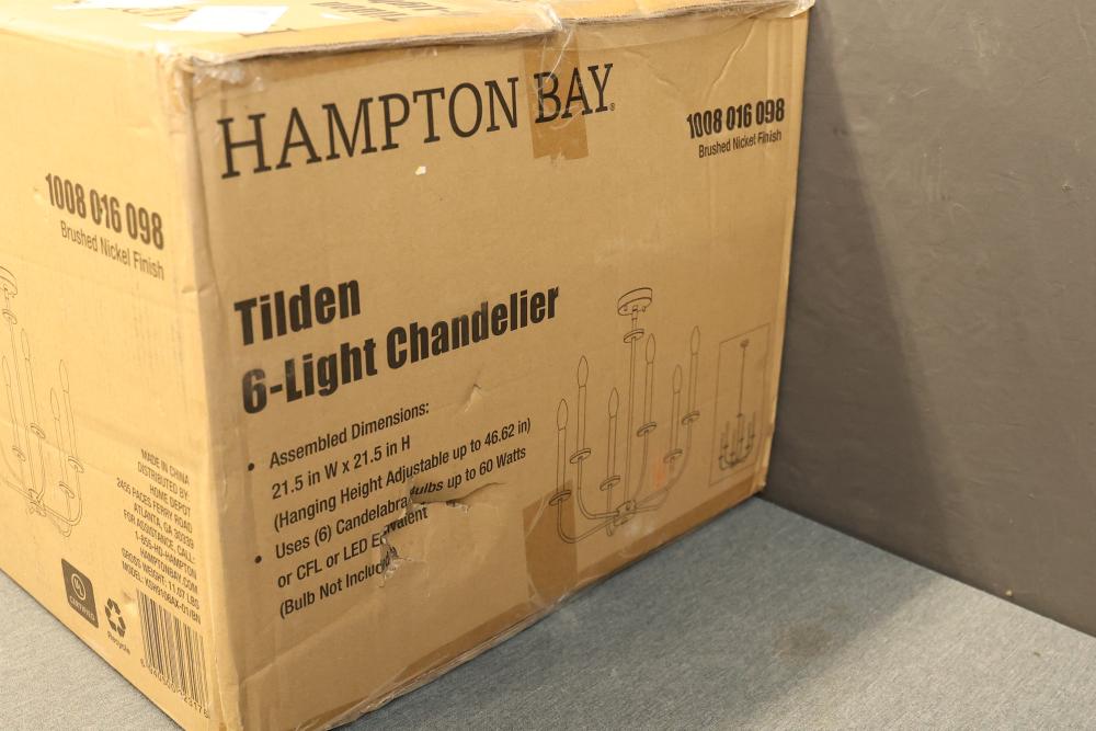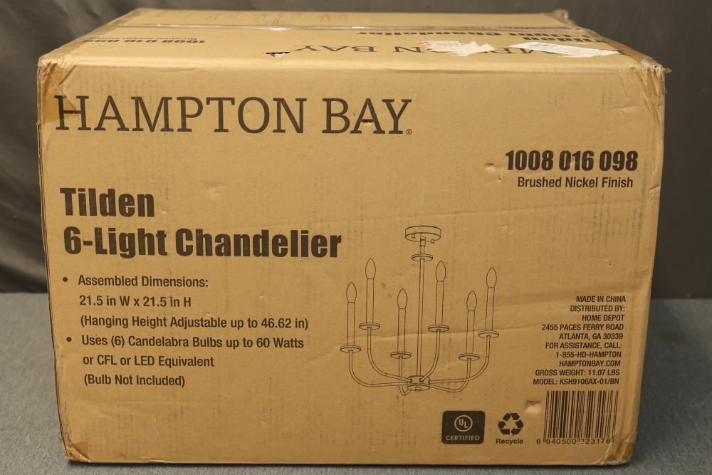 Hampton Bay Tilden 6-Light Brushed Nickel Chandelier (Model KSH9106AX-01/BN). Features a brushed nickel finish and accommodates (6) candelabra bulbs up to 60 watts each or CFL/LED equivalents. Assembled dimensions are 21.5 in W x 21.5 in H with an adjustable hanging height up to 46.62 in. Light bulbs are not included. Pickup only.