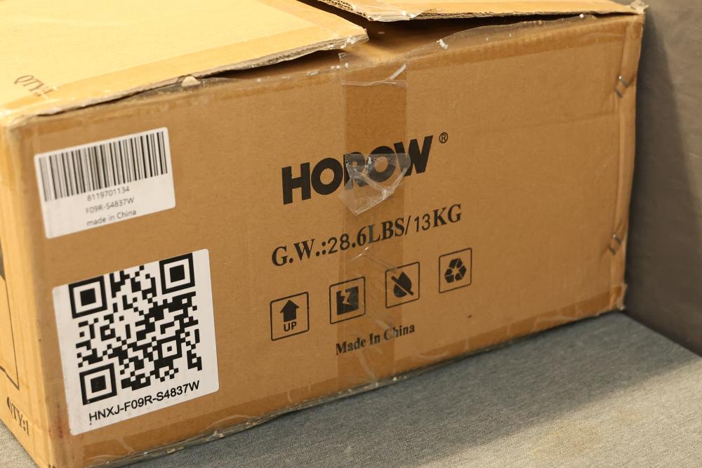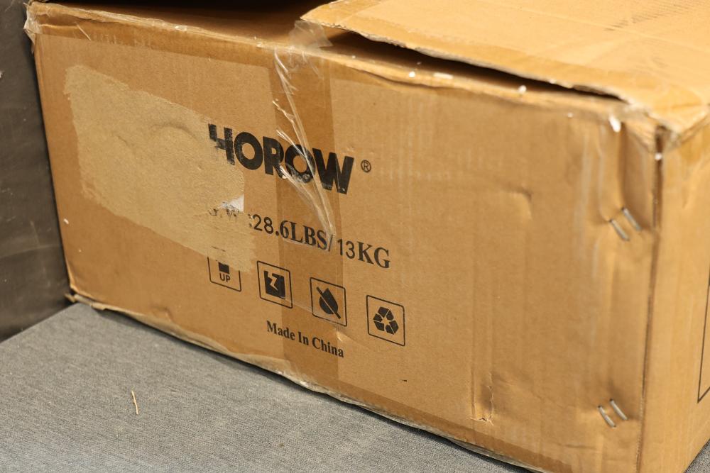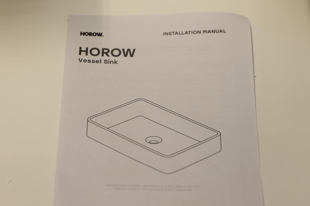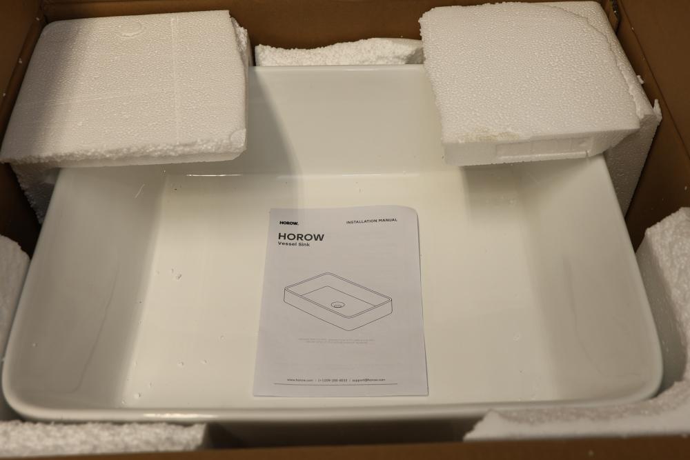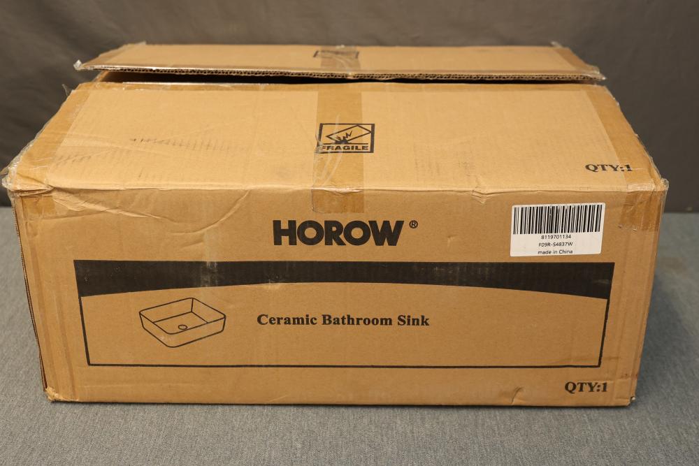 Horow 19 Inch Ceramic Vessel Bathroom Sink (Model F09R-S4837W) made of durable ceramic construction. The sink features a sleek rectangular design with a center drain hole. It comes in its original packaging, including an installation manual. Pickup only.