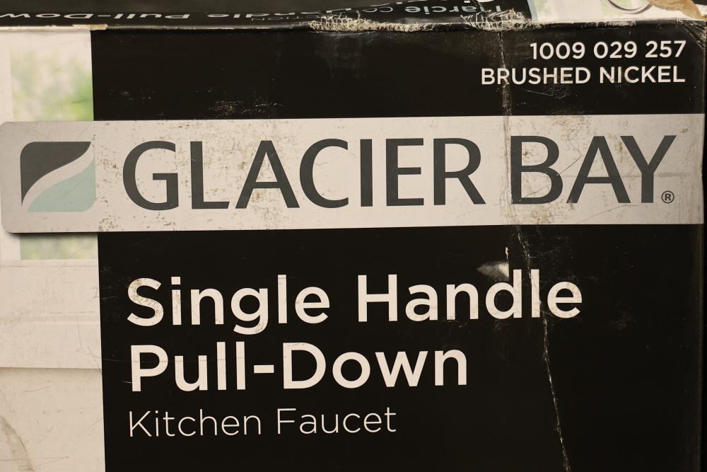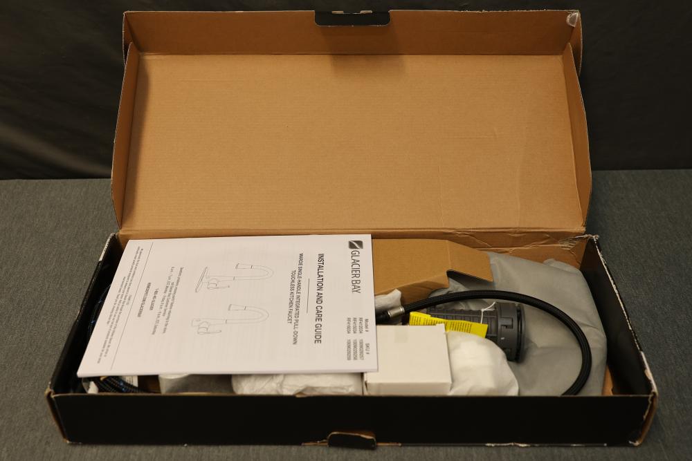 Glacier Bay Marcie Single-Handle Integrated Pull-Down Touchless Kitchen Faucet in Stainless Steel (Model RF412034). Features a brushed nickel finish, touchless technology, and a pull-down spray head. Includes installation instructions and components shown in original packaging. The item is new and appears unused. Pickup only.