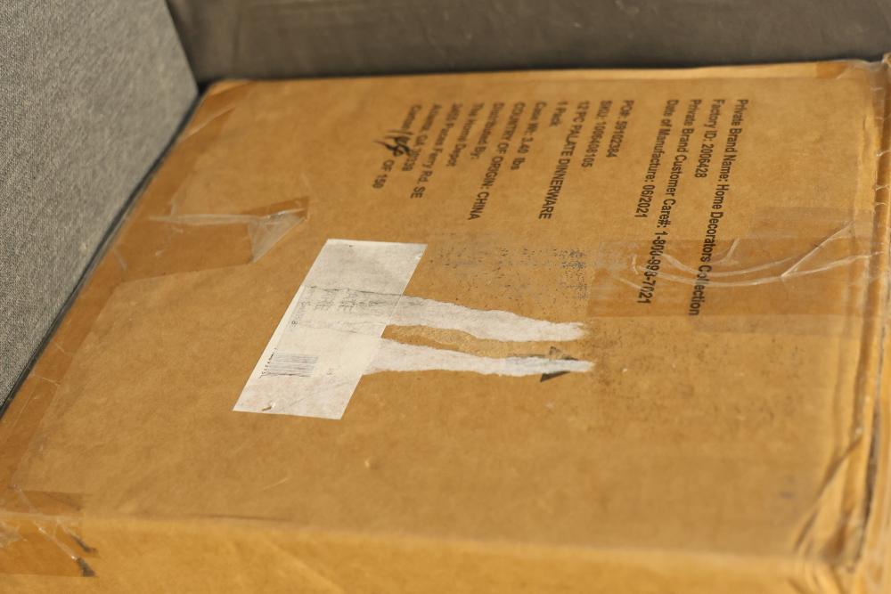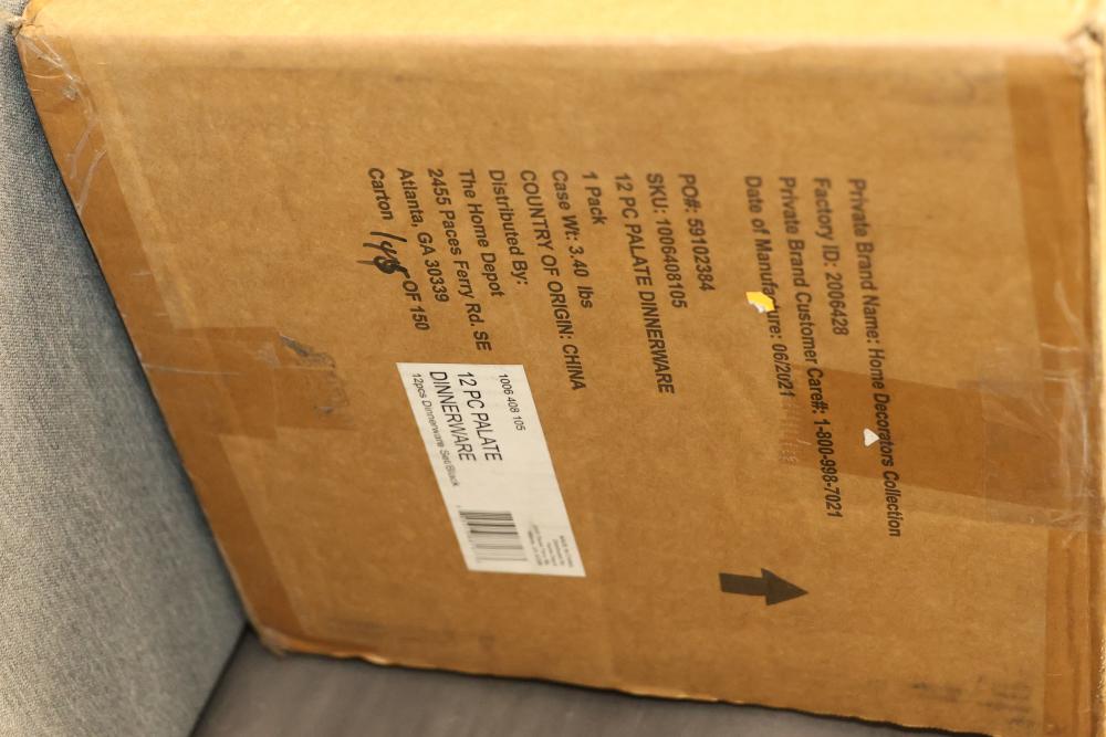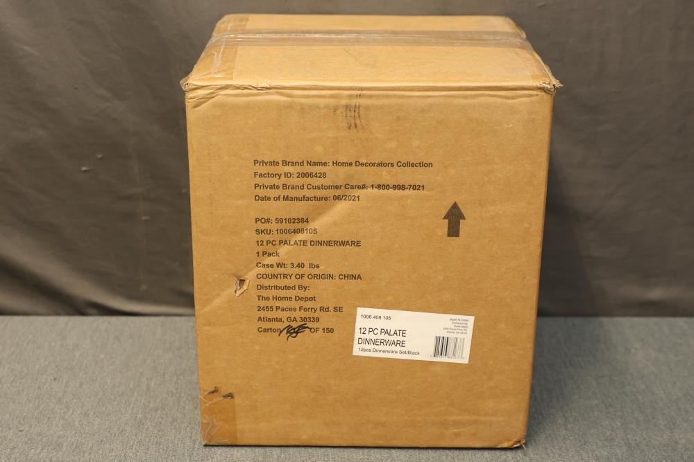 Home Decorators Collection Trenblay Melamine Dinnerware Set in Charcoal Black, Service for 4 (Model TPL1105MDSBB). This set includes 12 pieces designed for durability and style. Contents are packaged securely in the original box, and the set is unused. Pickup only.