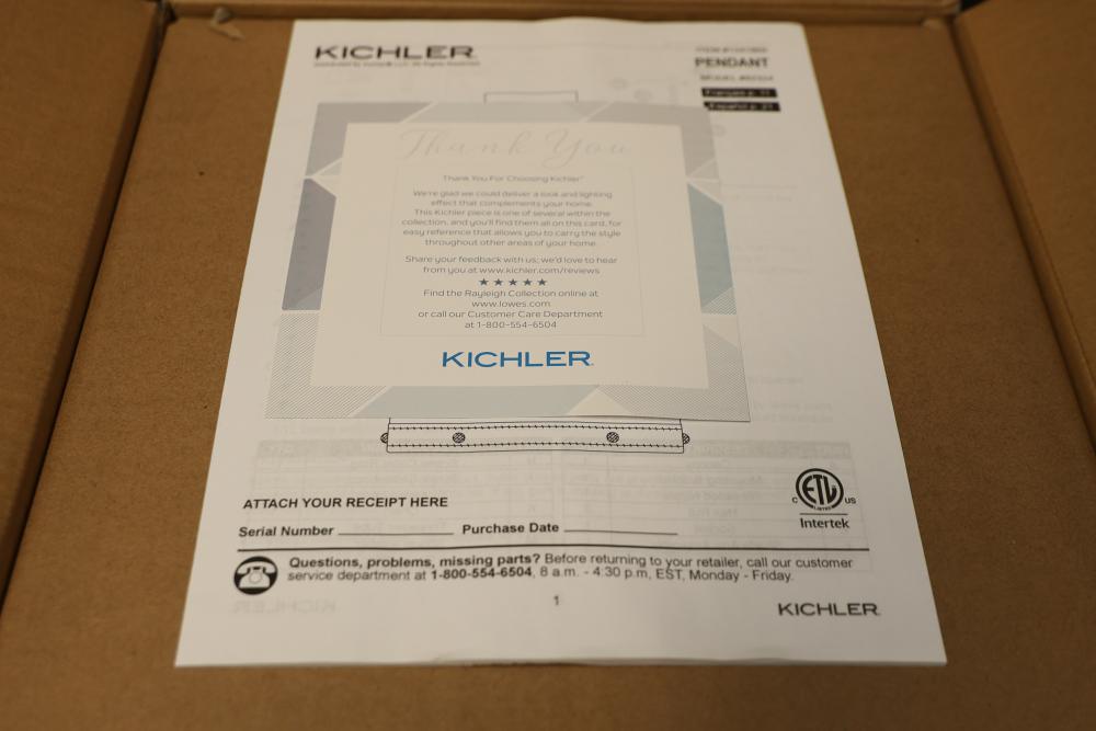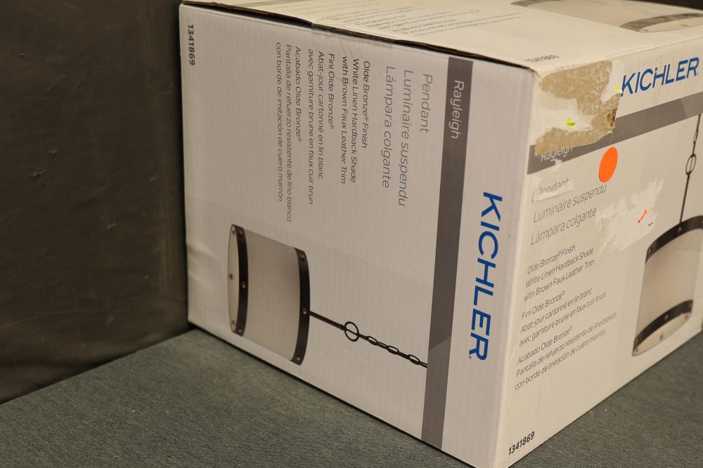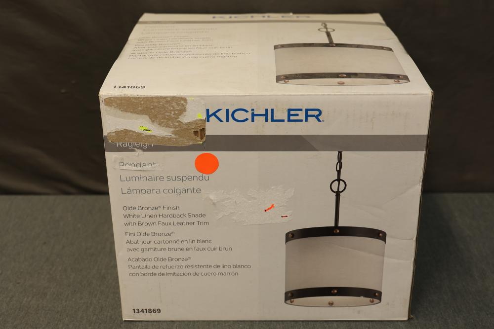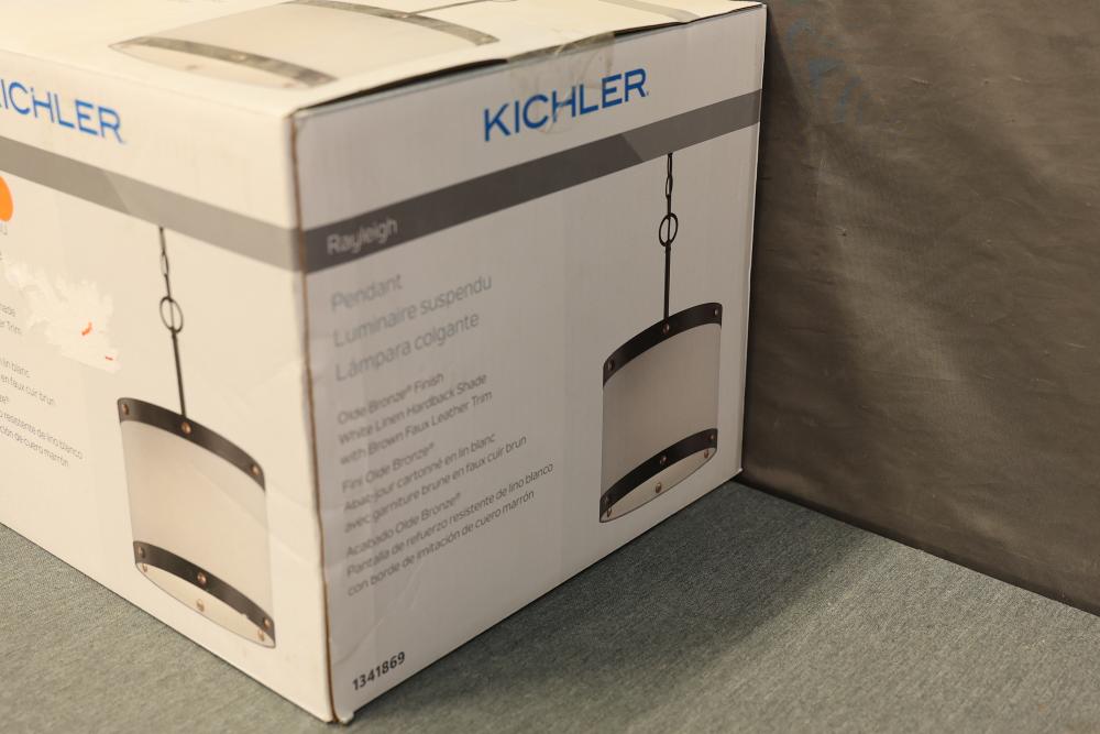 Kichler Rayleigh 60W 1-Light Pendant in Olde Bronze Finish, Model 82324. This pendant features a contemporary design with an Olde Bronze finish and a durable fabric drum shade. Offers a maximum wattage of 60W and comes with instructions and mounting hardware. The light is new in its original packaging. Pickup only.
