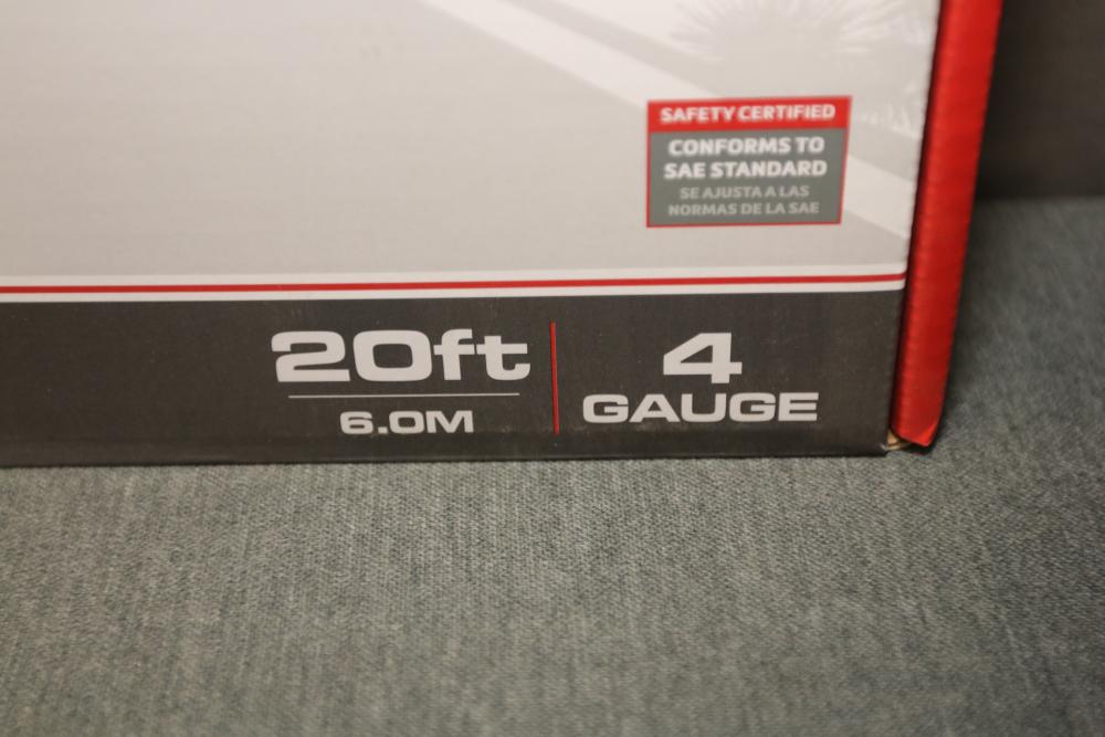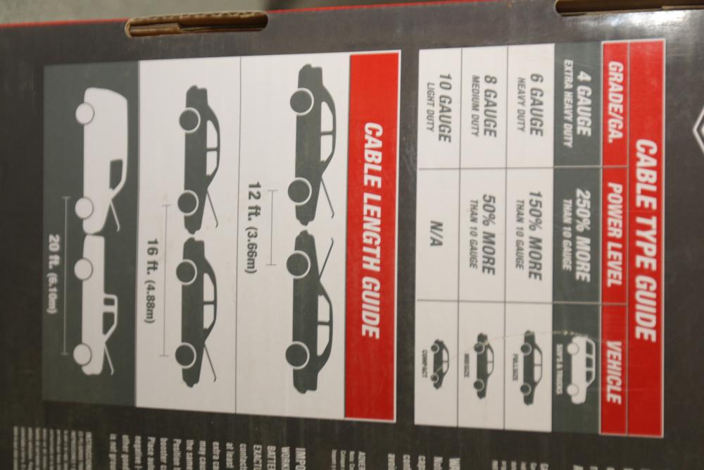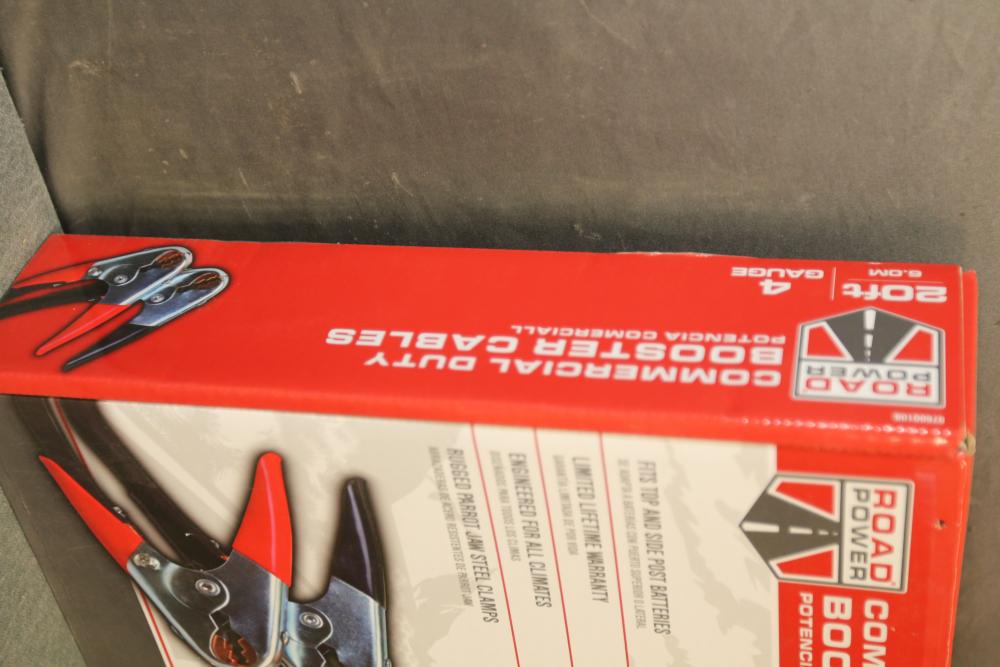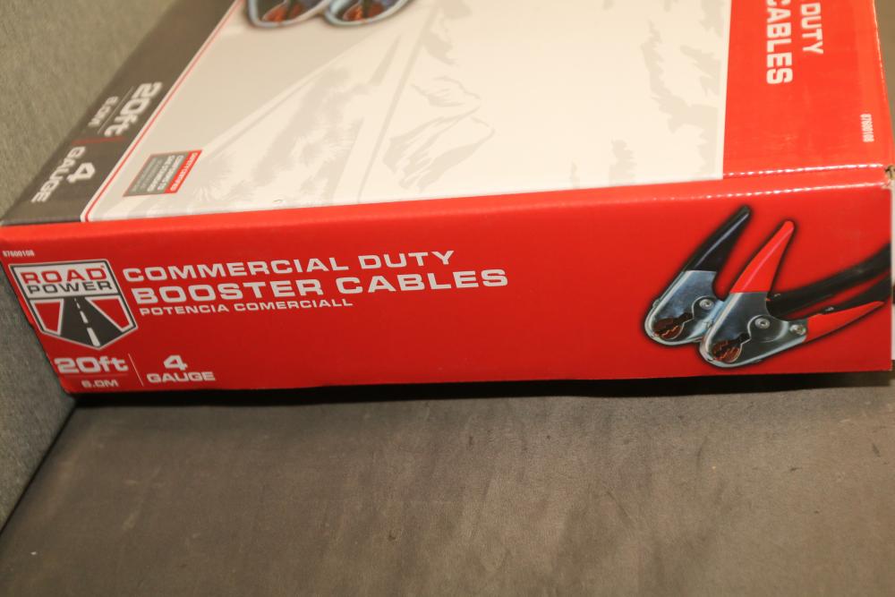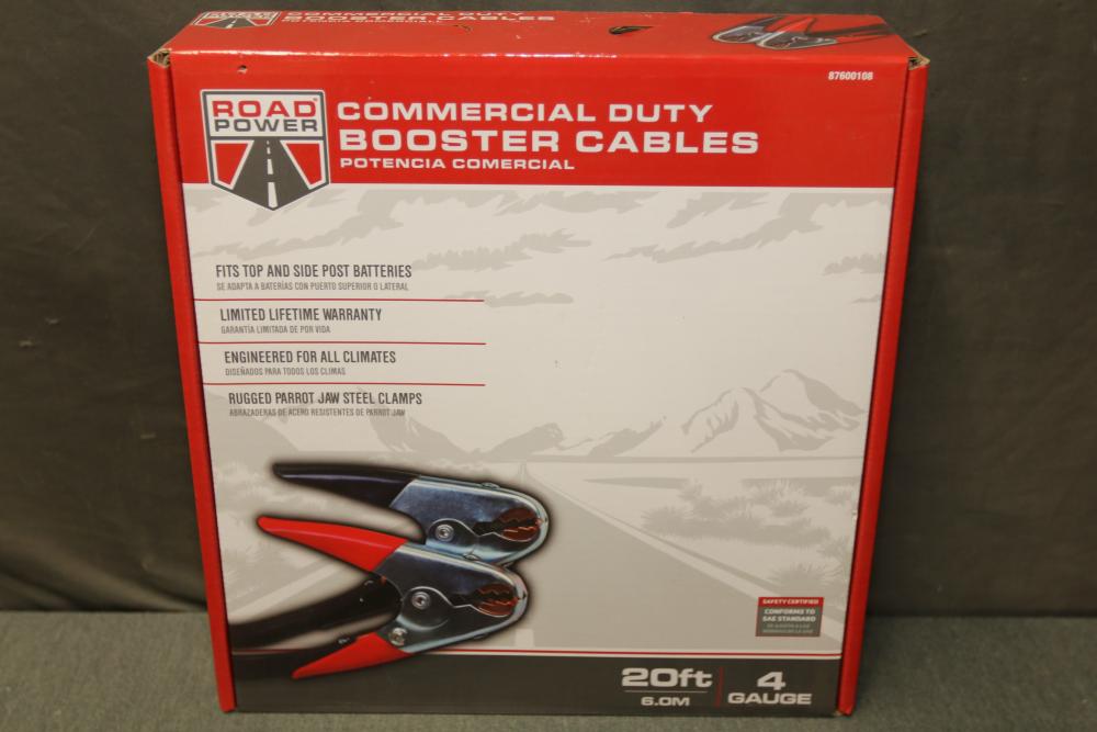 Road Power 20 Foot 4-Gauge 500 Amp Commercial Duty Booster Cables with Parrot Jaw Clamps in Black (Model 87600108). Features include rugged parrot jaw steel clamps, compatibility with top and side post batteries, and suitability for all climates. Conforms to SAE standards and includes a limited lifetime warranty. Pickup only.