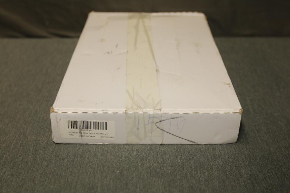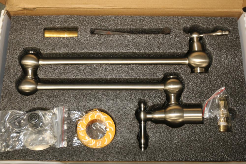 WOWOW Wall Mounted Pot Filler with 2-Handles and Double Joint Swing Arm in Brushed Nickel (Model 2311100-AMUS). Features a brushed nickel finish, double joint swing arm, and two handles for ease of use. The item comes in its original packaging with included installation accessories. Pickup only.