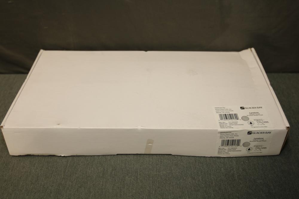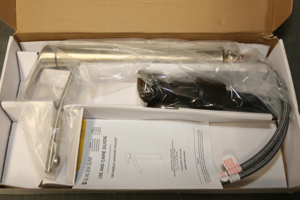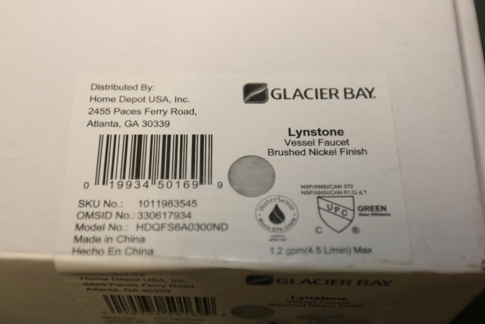 Glacier Bay Lynstone Vessel Faucet in Brushed Nickel Finish (Model HDQFS6A0300ND). Features a sleek brushed nickel finish, ideal for vessel sinks. Includes faucet and necessary installation parts as shown. The item is new and comes in its original packaging with manuals and components. Pickup only.