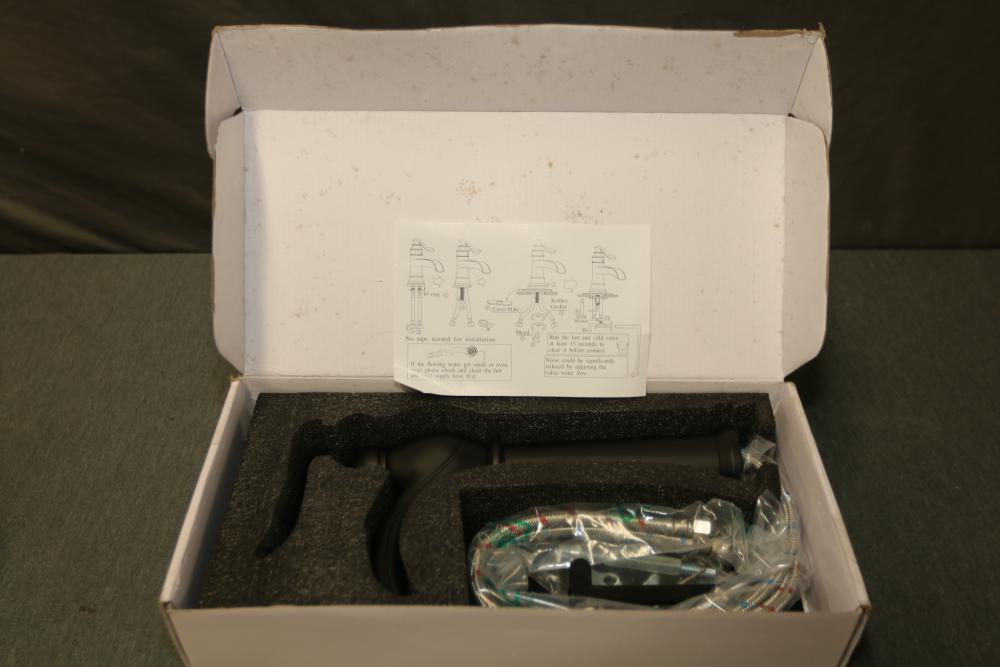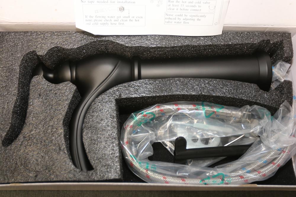 BWE WaterSense One-Handle Vessel Waterfall Bathroom Sink Faucet (Model A-96559H-BLACK) in a black finish. Includes faucet, installation hardware, and instructions. Designed for a vessel sink with WaterSense certification for efficient water use. Appears unused in its original packaging. Pickup only.