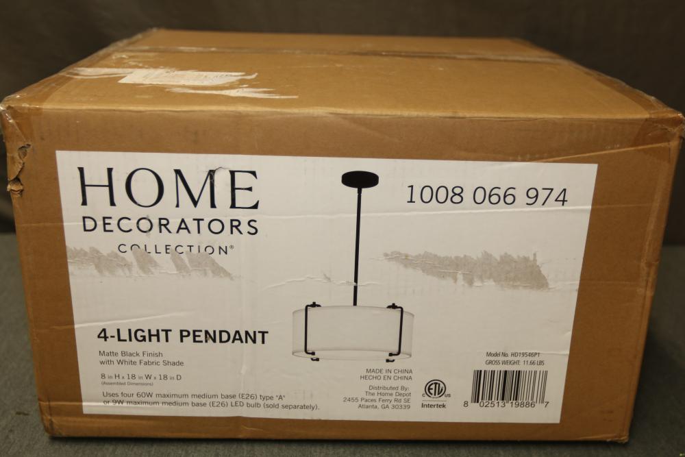 Home Decorators Collection 4-Light Matte Black Pendant with White Fabric Shade (Model HD19546P1). The pendant features a sleek matte black finish and a white fabric drum shade, creating a modern aesthetic. Fully packaged with parts and instruction manual included. Pickup only.