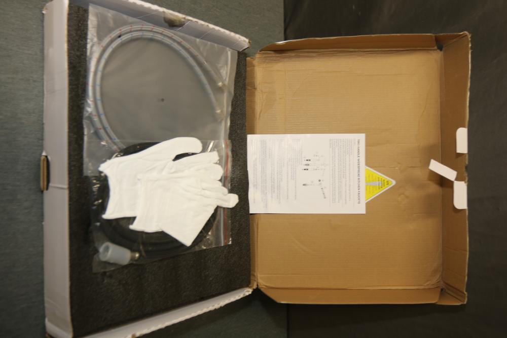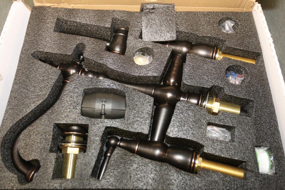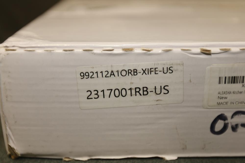 WOWOW Double-Handle Deck-Mount Bridge Kitchen Faucet with Sprayer in Oil Rubbed Bronze (Model 2317001RB). Includes faucet, sprayer, hoses, and installation accessories. Comes in original box with instruction manual. Box shows signs of wear, but contents appear unused. Pickup only.