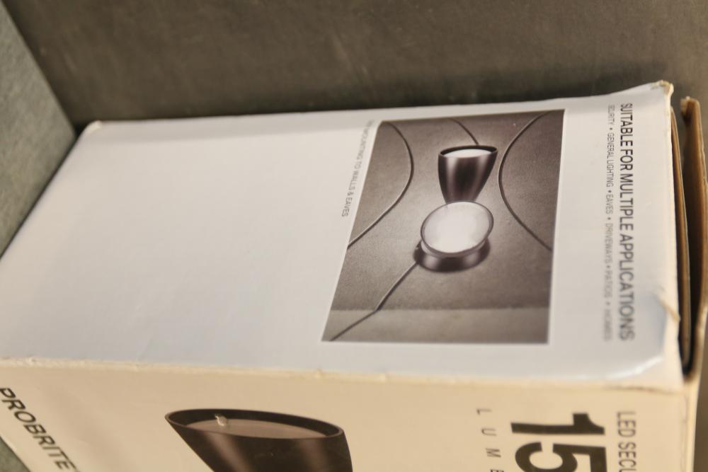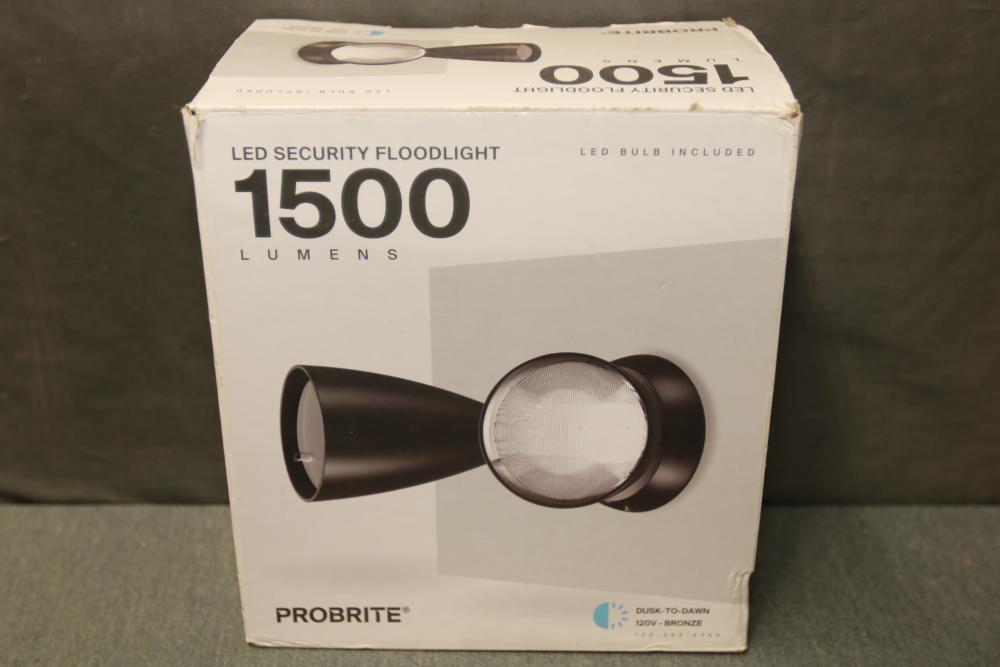 ProBrite Twin-Head Directional Bronze Outdoor Integrated LED Flood Light for Outdoor Security (Model TPAR2-PC-BZ). This 15-watt floodlight provides 1500 lumens of brightness and features a dual-head design for versatile mounting. It includes an integrated photocell and has a color rendering index (CRI) of 80 with a daylight 4000K color temperature. Dimensions are 8.92 inches (L) x 8.42 inches (W) x 5.10 inches (H). Pickup only.