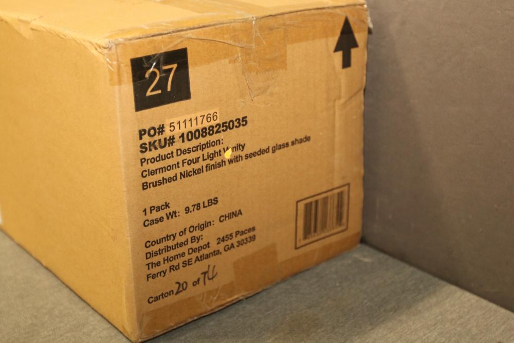 Home Decorators Collection Clermont 30.75 Inch 4-Light Brushed Nickel Bathroom Vanity Light with Seeded Glass Shade (Model 4001004SG-962). Features a brushed nickel finish with seeded glass shades and a deep base design. Measures 30.75 inches by 7.32 inches by 8.96 inches. Bulbs are not included. Pickup only.