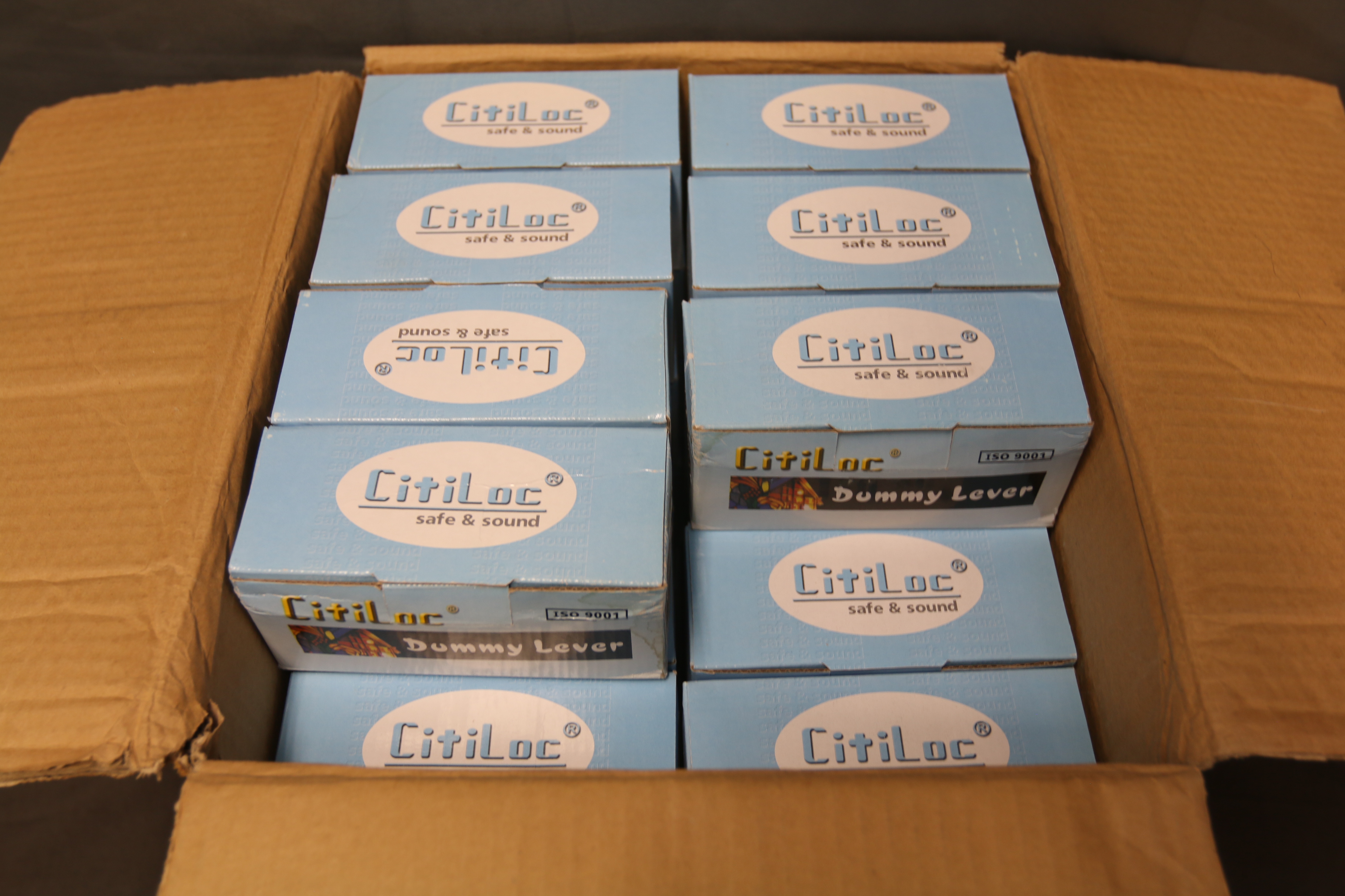 CitiLoc Antique Brass Arcadia Dummy Right Hand Lever (Model BP-515T-AR-US5 RH). Includes 47 levers in total, each individually boxed and featuring a US5 antique brass finish. Every lever is packaged in a sealed bag within its labeled box, ensuring protection. Pickup only.