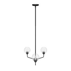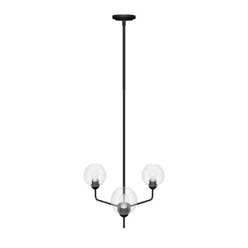 Origin 21 Soren 3-Light Matte Black Clear Glass Metal Chandelier (Model ELW280325-MB). Features a matte black metal finish with three clear glass shades, offering a sleek and modern design. New in original packaging with all components included. Pickup only.