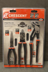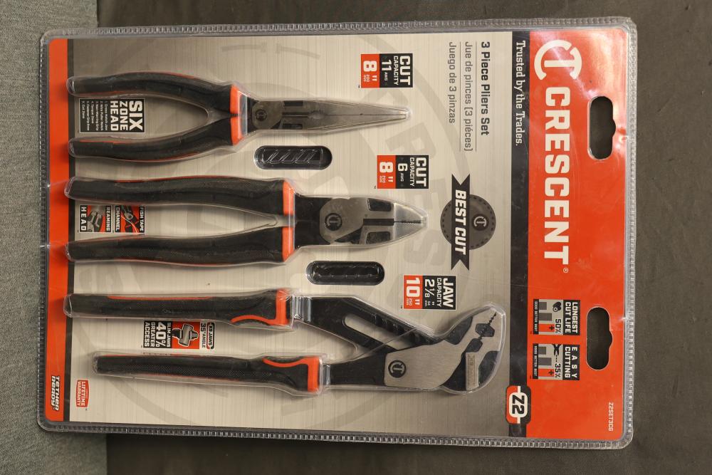 Crescent Z2 Mixed Dual Material High Leverage 3-Piece Plier Set (Model Z2SET3CG). Includes an 8-inch long nose plier, an 8-inch diagonal cutting plier, and a 10-inch tongue & groove plier. Features a six-zone head design, increased cutting capacity, and enhanced durability with ergonomic dual material grips. Pickup only.
