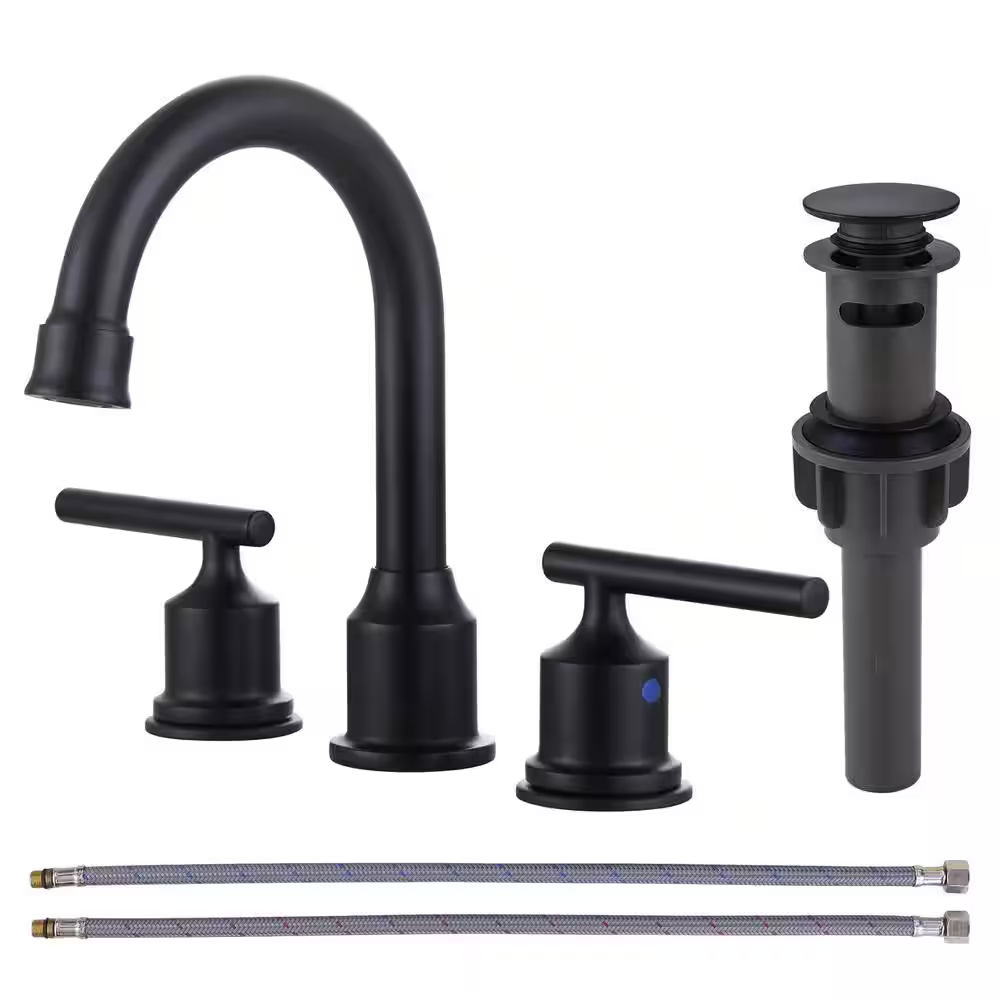 WOWOW 8 Inch Widespread Double Handle Bathroom Faucet with Drain Kit in Matte Black (Model 2320500B-HD). Includes faucet, matching drain kit, and necessary installation accessories. Presented in original packaging with visible wear and label details shown. Pickup only.