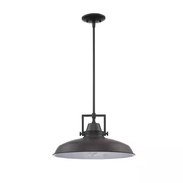 Hampton Bay Wilhelm 16 Inch 1-Light Bronze Industrial Farmhouse Pendant Light Fixture with Metal Shade (Model L4927-16BZ). Features a durable bronze finish, metal shade, and adjustable 36-inch downrod for a maximum hanging height of 46.5 inches. Requires one 60-watt max E26 medium base bulb (not included). Pickup only.