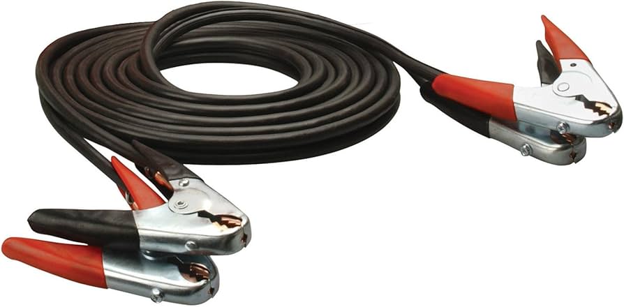 Road Power 20 Foot 4-Gauge 500 Amp Commercial Duty Booster Cables with Parrot Jaw Clamps in Black (Model 87600108). Features include rugged parrot jaw steel clamps, compatibility with top and side post batteries, and suitability for all climates. Conforms to SAE standards and includes a limited lifetime warranty. Pickup only.