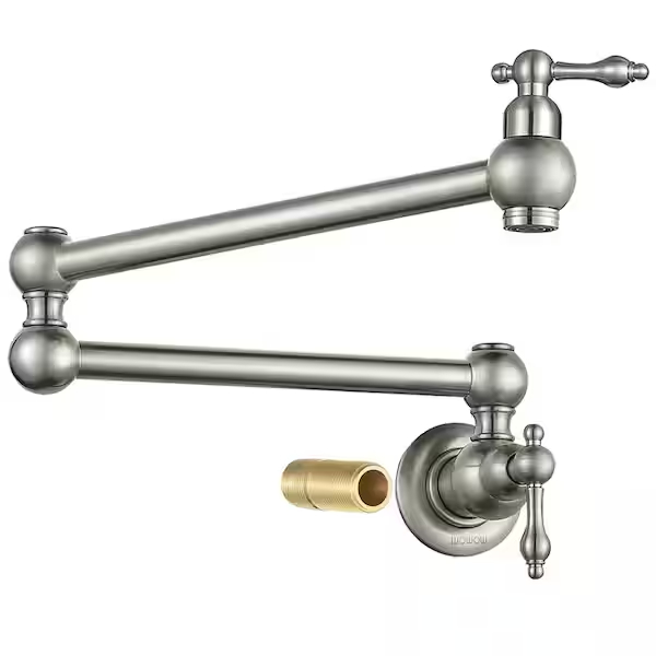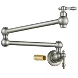 WOWOW Wall Mounted Pot Filler with 2-Handles and Double Joint Swing Arm in Brushed Nickel (Model 2311100-AMUS). Features a brushed nickel finish, double joint swing arm, and two handles for ease of use. The item comes in its original packaging with included installation accessories. Pickup only.