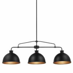 Hampton Bay Tallulah 38 Inch 3-Light Linear Chandelier with Matte Black Finish and Gold Interior (Model 65246). Features a matte black exterior with a gold-colored interior, and supports 60-watt maximum medium base bulbs (sold separately). Dimensions are 38 x 16 x 16 inches. Pickup only.