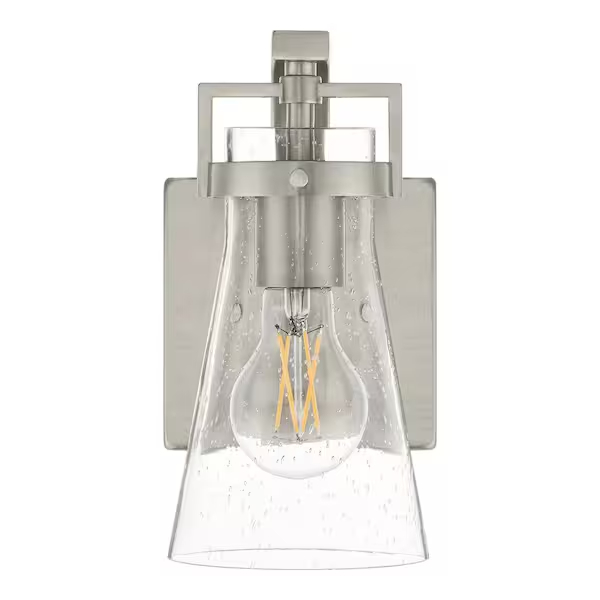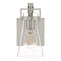 Home Decorators Collection Clermont 5 Inch 1-Light Brushed Nickel Bathroom Vanity Light with Seeded Glass Shade (Model 4001001SG-962). Features a brushed nickel finish and a seeded glass shade, designed for bathroom vanity use. Item is in its original packaging with a weight of 3.03 lbs. Pickup only.