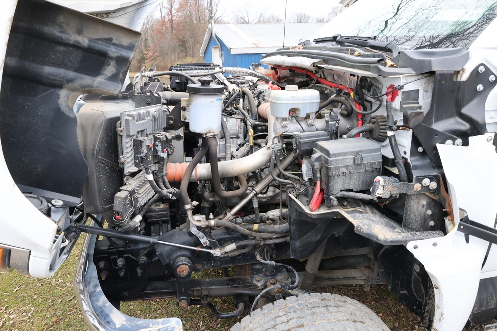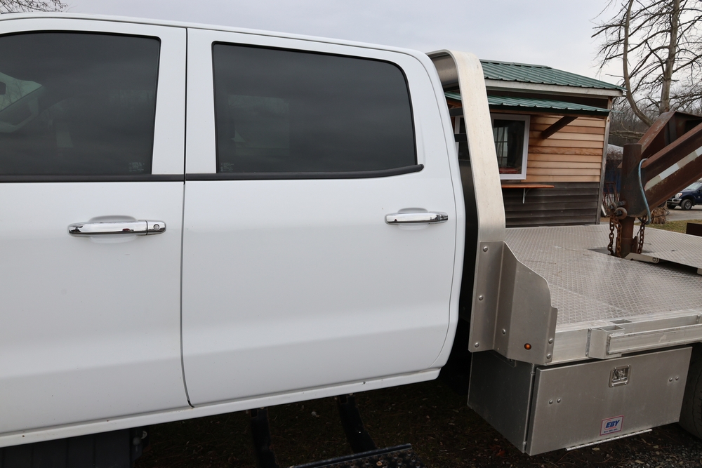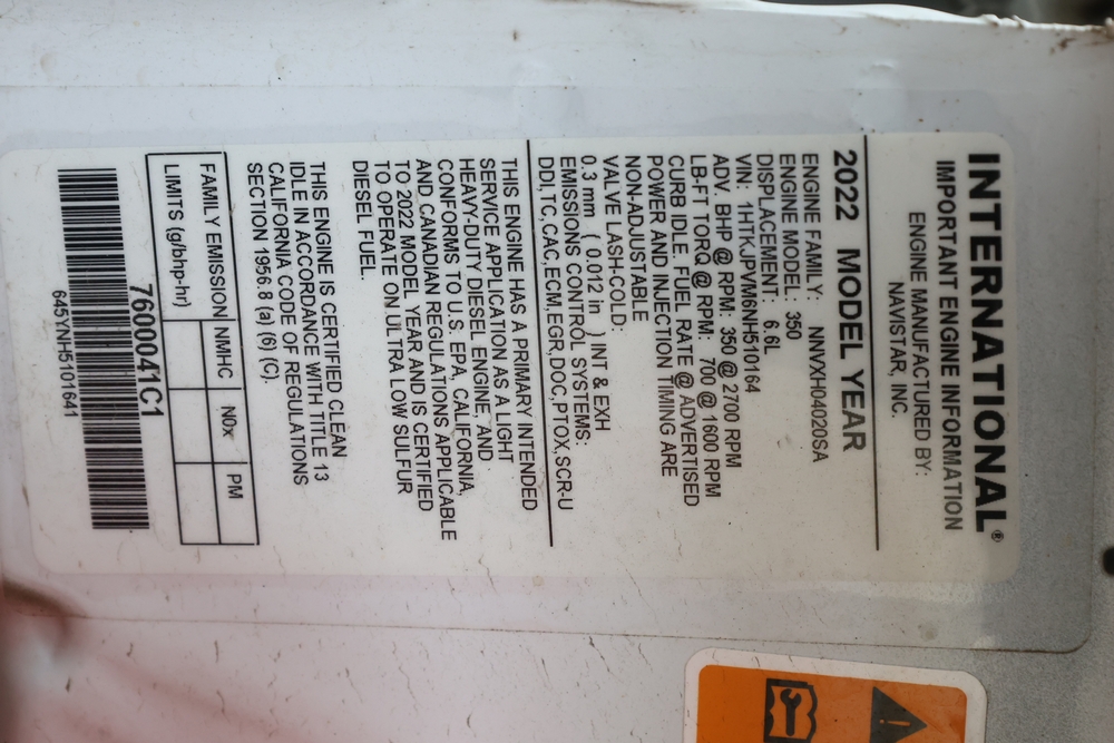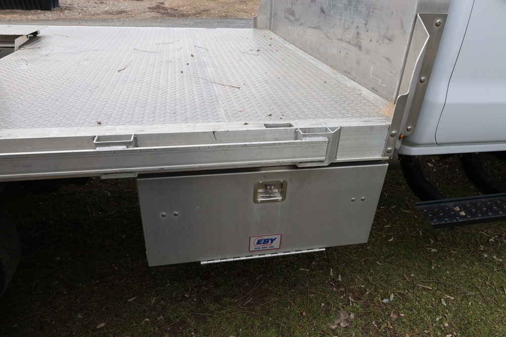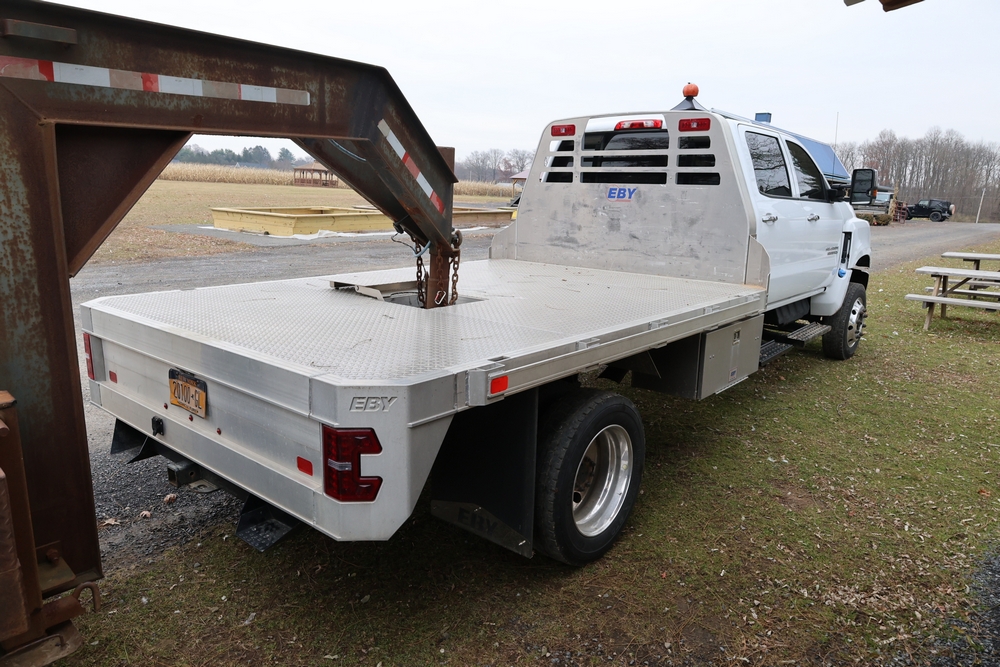 2022 International GM515 crew-cab flatbed truck. VIN: 1HTKJPVM6NH510164. Engine: 6.6L diesel, automatic transmission, 4WD. Odometer reading: 33617 miles. Features include dual rear wheels, aluminum Eby flatbed, running boards, touchscreen audio display. Runs and drives. Title and key available. NOTE: This item has a lien which will be satisfied upon payment for purchase in the auction. The vehicle(s) listed in this event will have the lien and title released upon payment directly to the secured creditor once paid for by the purchaser.