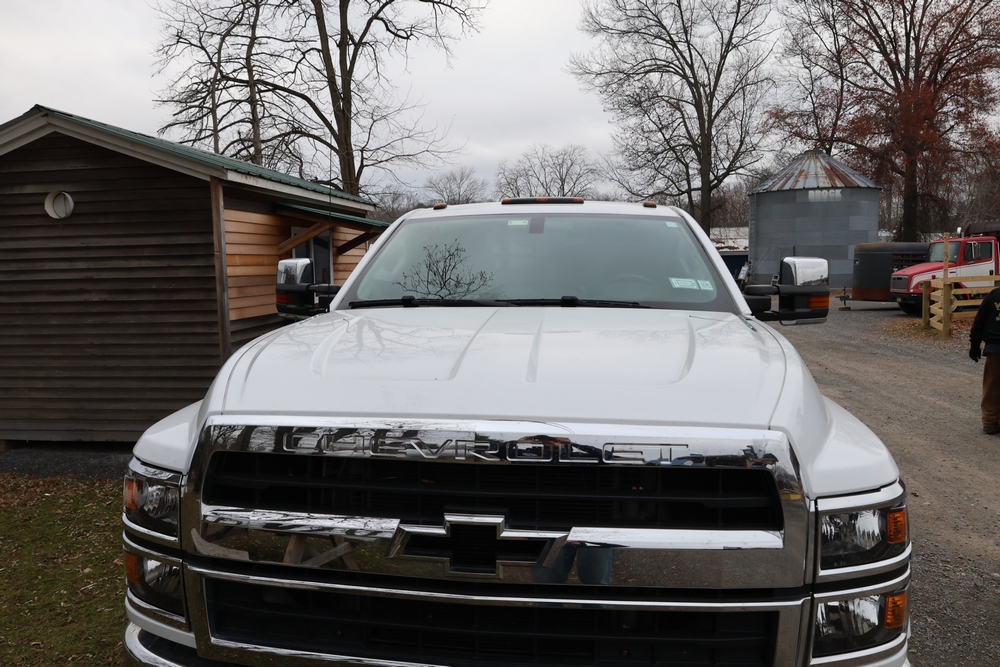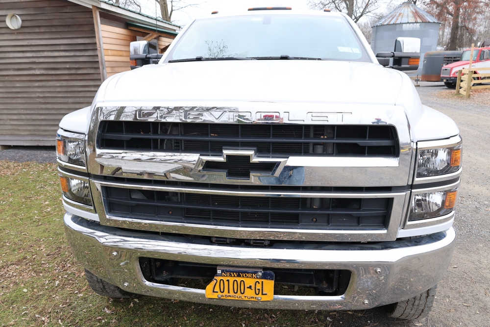 Items include J2022 International GM515 crew-cab flatbed truck; 2003 Rolls Rite 35' gooseneck equipment trailer; 9' Storm Guard snow plow with Fisher Minute Mount 2 system; Fisher Minute Mount 2 snow plow & 7.5' yellow snowplow blade. Items are located in Rhinebeck, NY.