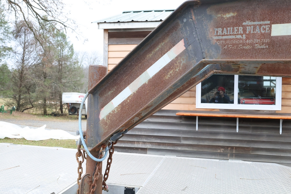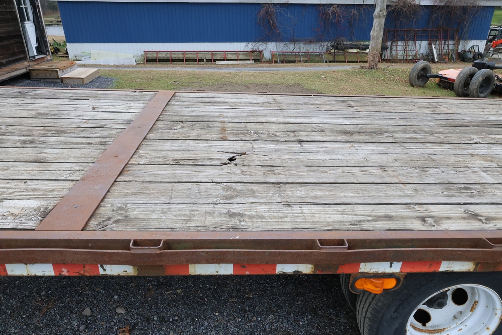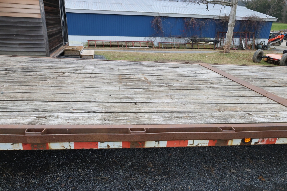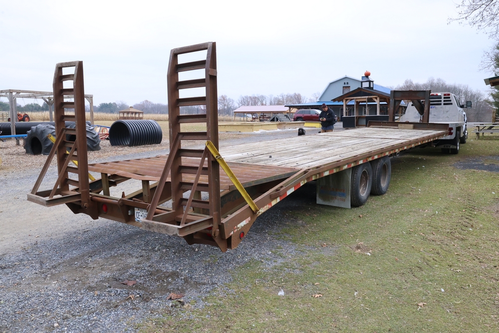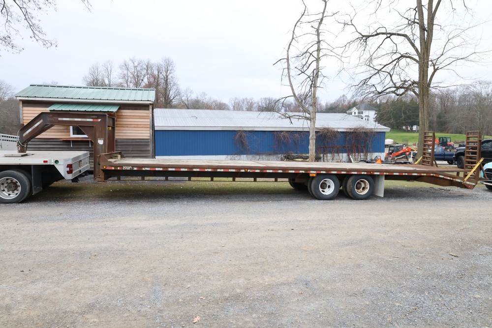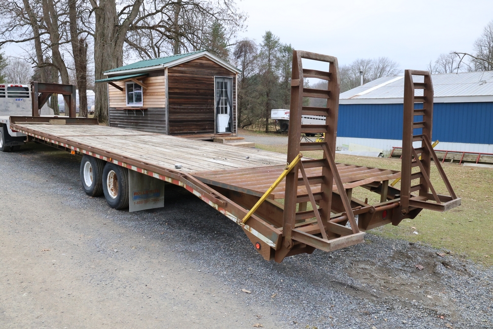 Items include J2022 International GM515 crew-cab flatbed truck; 2003 Rolls Rite 35' gooseneck equipment trailer; 9' Storm Guard snow plow with Fisher Minute Mount 2 system; Fisher Minute Mount 2 snow plow & 7.5' yellow snowplow blade. Items are located in Rhinebeck, NY.