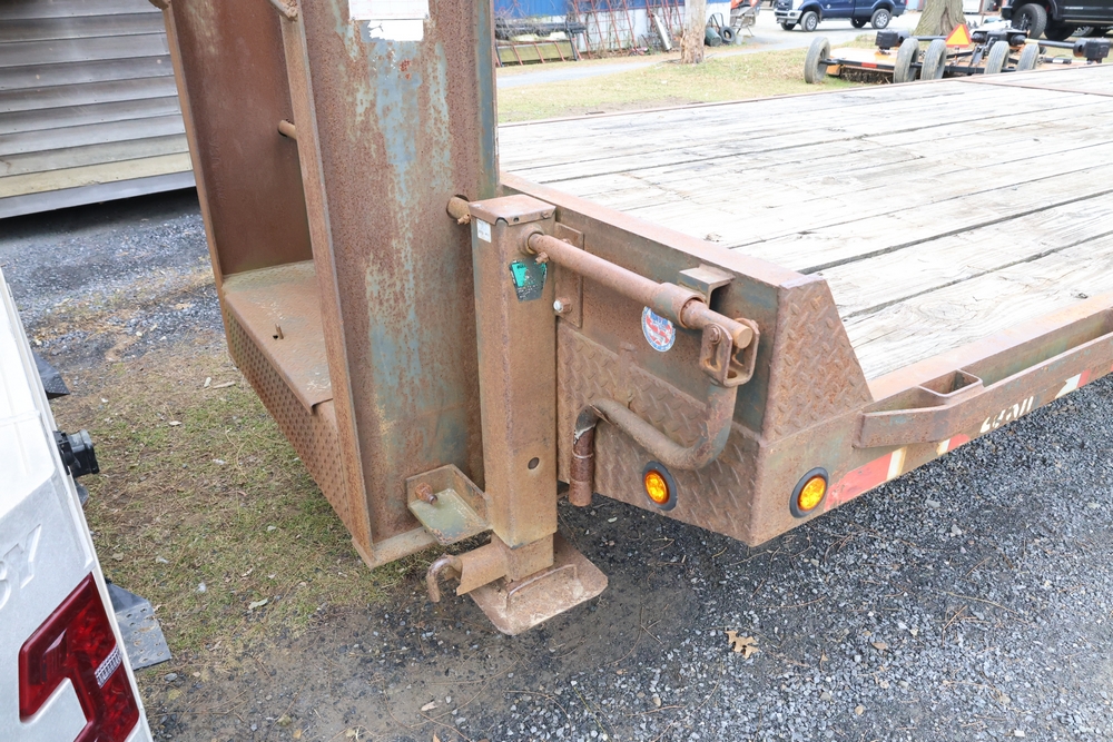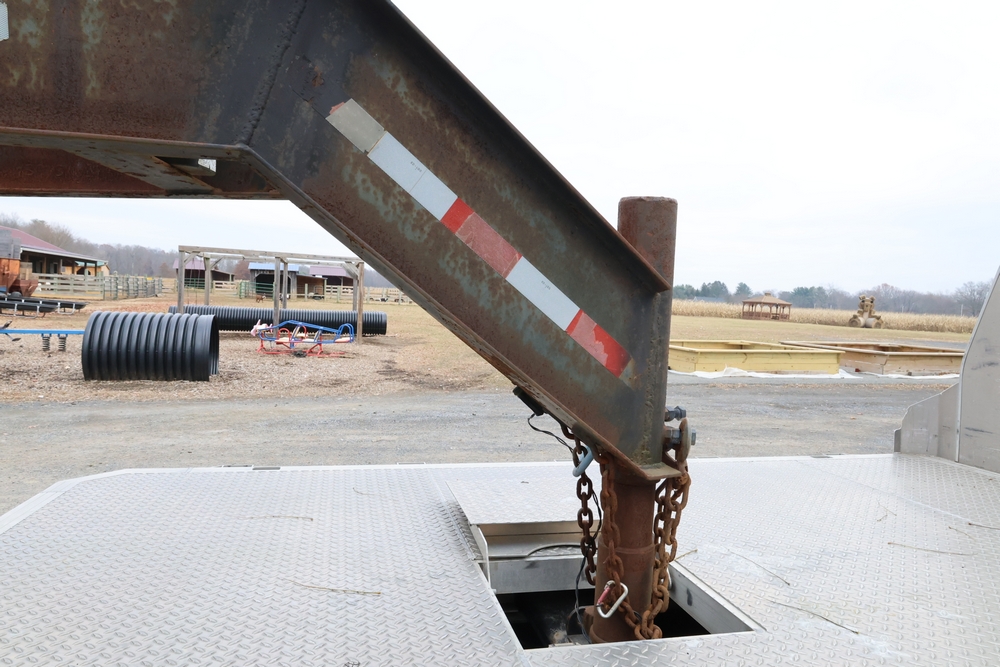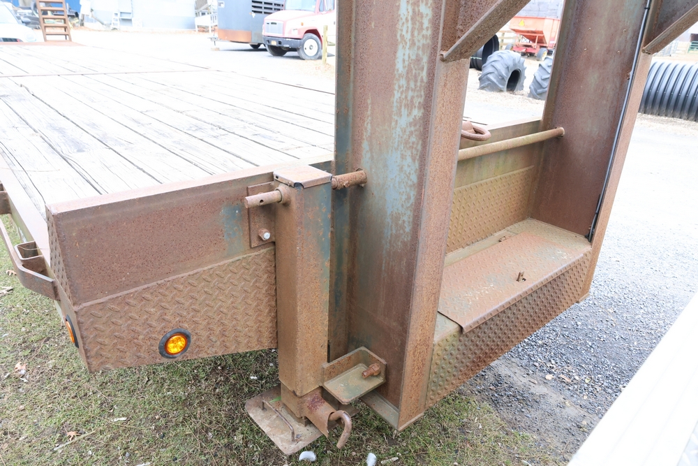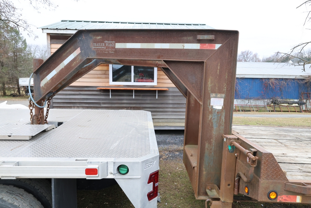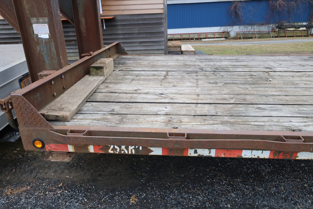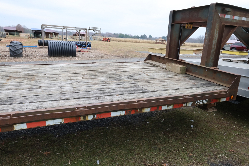 2003 Rolls Rite 35' gooseneck equipment trailer. VIN: 1R9GD35263M356296. GVWR listed as 25,000 lb on trailer markings. Tandem dual-wheel axle configuration with electric brakes visible. Features a wood deck, steel beavertail, flip-up loading ramps, stake pockets along the deck, gooseneck hitch, and 7-pin electrical connector. Manufacturer’s ID plate shows GAWR values of 10,000 lb front and 10,000 lb rear.