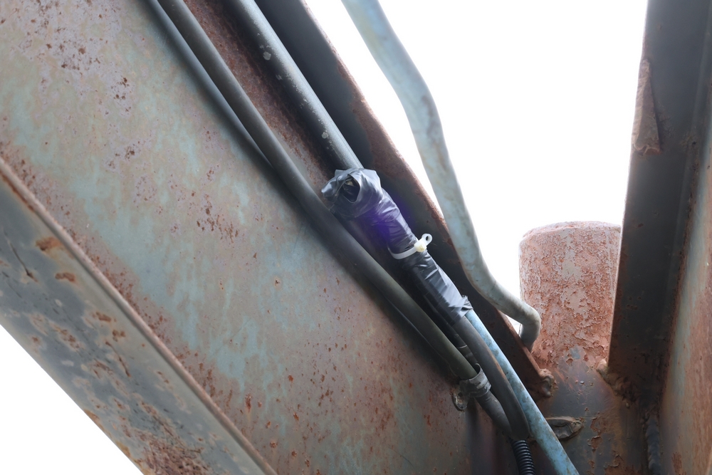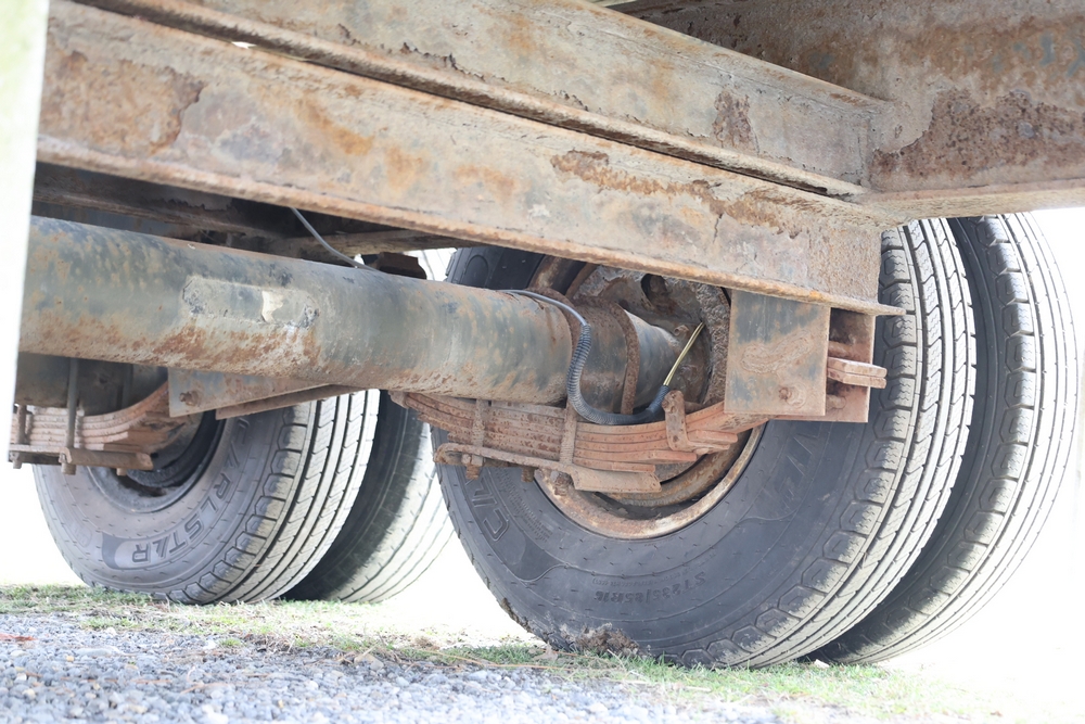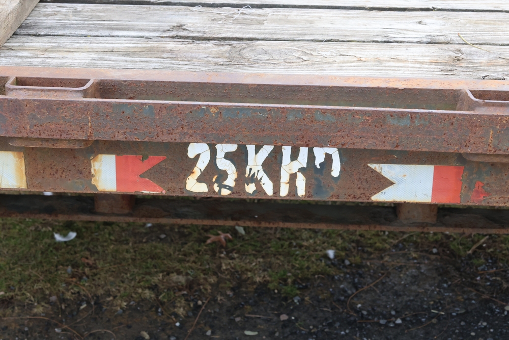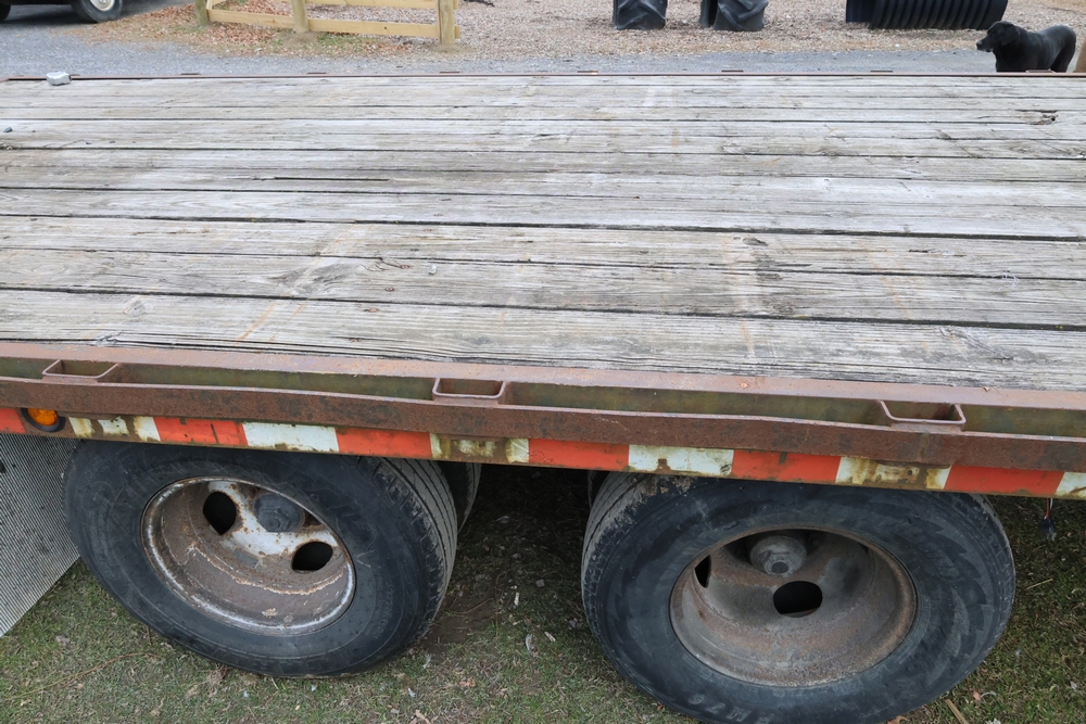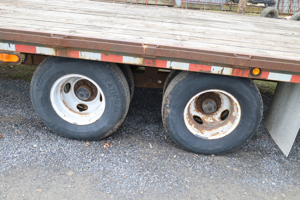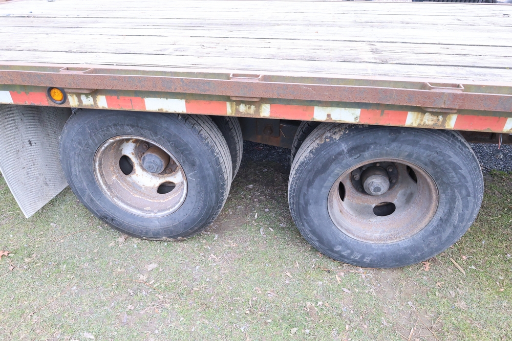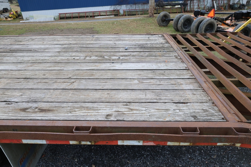 2003 Rolls Rite 35' gooseneck equipment trailer. VIN: 1R9GD35263M356296. GVWR listed as 25,000 lb on trailer markings. Tandem dual-wheel axle configuration with electric brakes visible. Features a wood deck, steel beavertail, flip-up loading ramps, stake pockets along the deck, gooseneck hitch, and 7-pin electrical connector. Manufacturer’s ID plate shows GAWR values of 10,000 lb front and 10,000 lb rear.