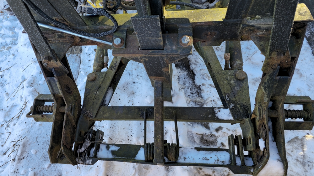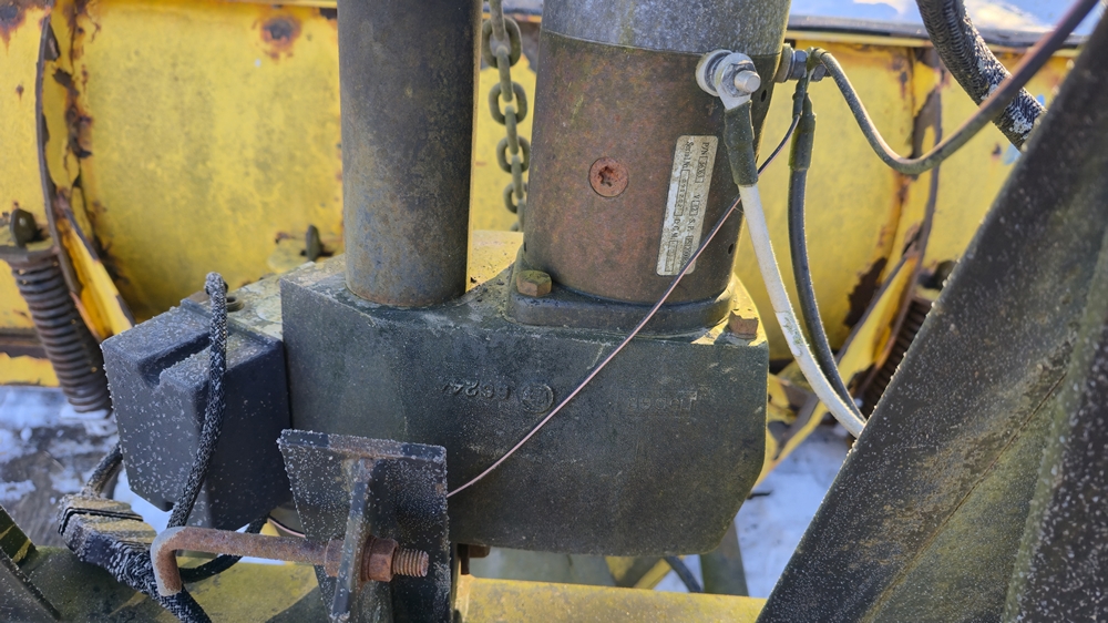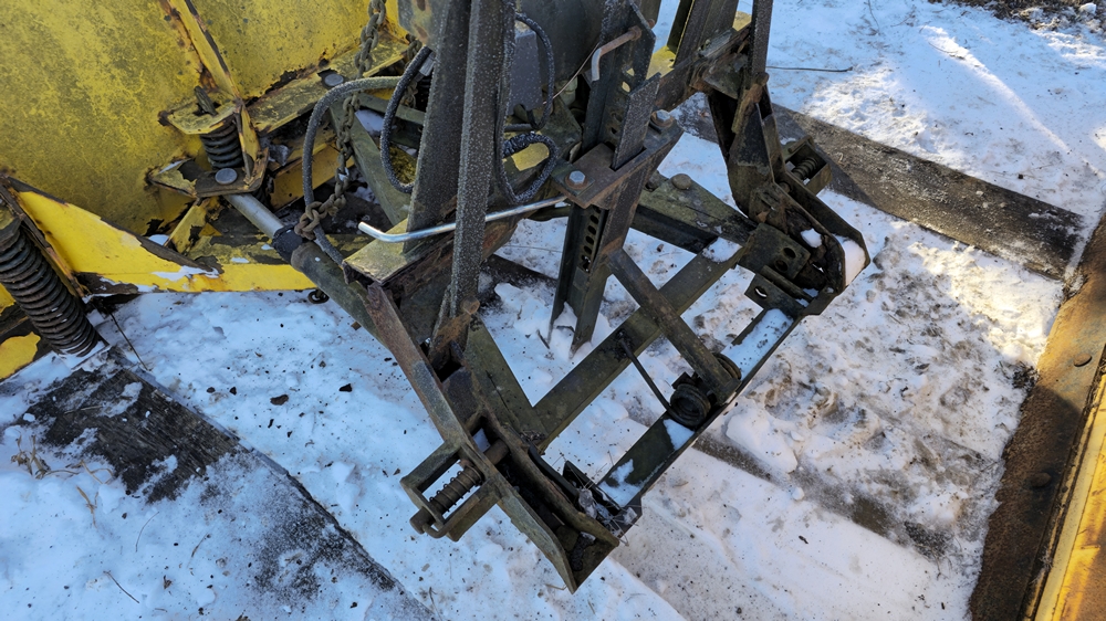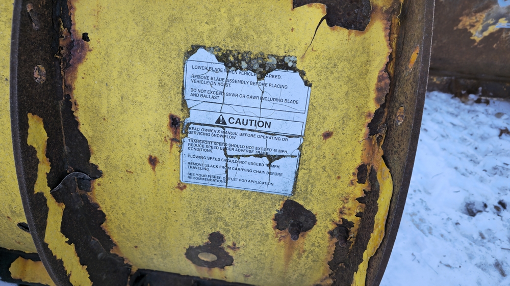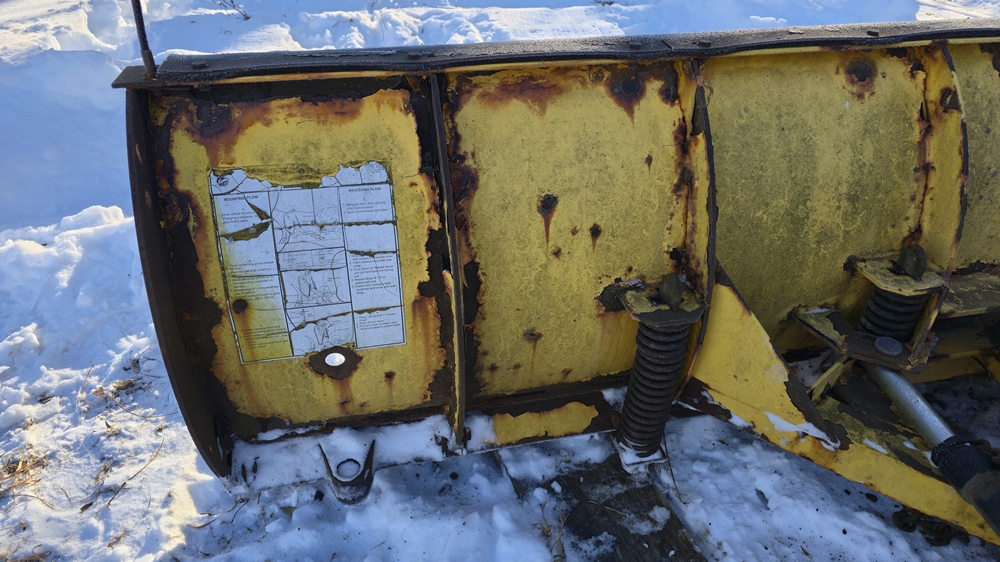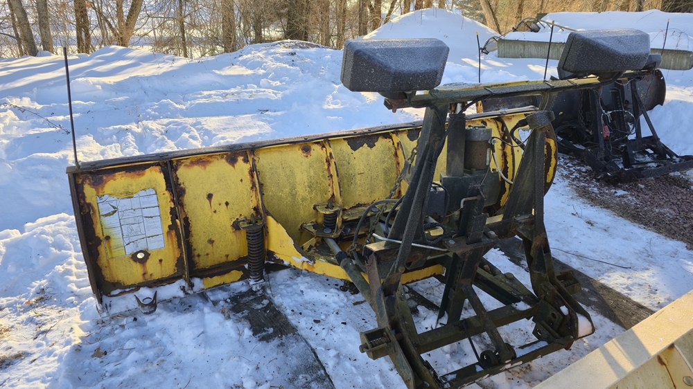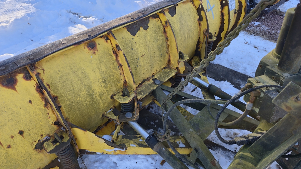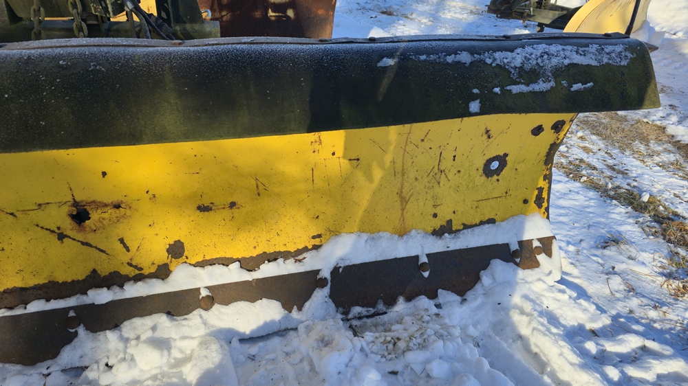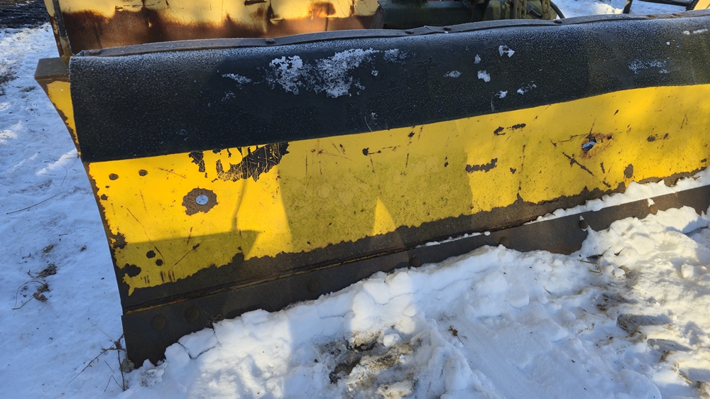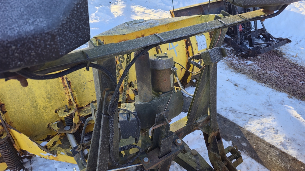 Fisher Minute Mount 2 snow plow with hydraulic power unit, headlamps, and wiring harness. Blade measures approximately 9 feet wide, controller not included.
