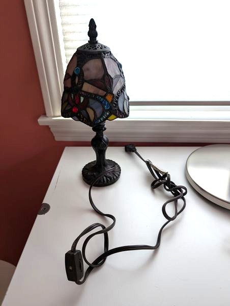 Contemporary Cabinet, Side Tables, Décor. White cab (matches pics in lot #3), 32"Wx18"Dx31"H with one adjustable shelf; pair of modern side tables with cut-away shelf, ea. 16"diam x20"H; table lamps as seen in photos; hand-painted glazed dish from Greece.