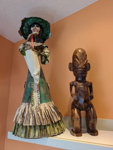 International Décor. Twelve pcs incl: tallest 32"H from Mexico; wooden sculpture, 21"H; two Zodiac Star Dancers (see provenance); eight others incl: Doug Harris "Maybelle"; one hand-painted; two by Genesis; two others. See photos for more details. Shelves not incl.