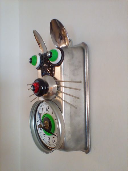 Cat-Motif Kitchen Entertaining. Nine pcs Tazon Ond Gata, oval bowl 9"L; three Pier 1 cat vessels; lg bowl, 10"diam; cat wall clock (made of loaf pan & spoons); other related items as seen in photos on kitchen counter (right of stove).