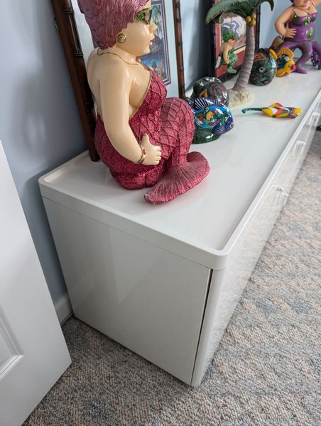 Beach Décor and Long Cabinet. Multi-functional white cab, 63"Wx17"Dx20"H (matches pcs in lots #41, 49); wall décor, incl destressed wood "Beach" sign, 44"Wx16"Hx2"thick; lg whimsical mermaid figures; other beach décor & wall art as seen in photos. Loc on 2nd floor. Bring help to navigate lg cabinet.
