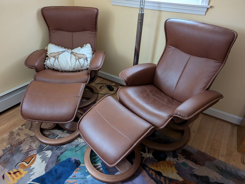 Fjords Recliners; Floor Lamp; Area Rug. Pair of light brown leather Fjords recliners, ea. 32"Wx26"Dx39"H with foot rests, ea. 21"Wx15"H; nickel floor lamp, 6'H; New Wave area rug, approx. 5'x8' (req cleaning); giraffe pillow. Loc on 2nd floor.