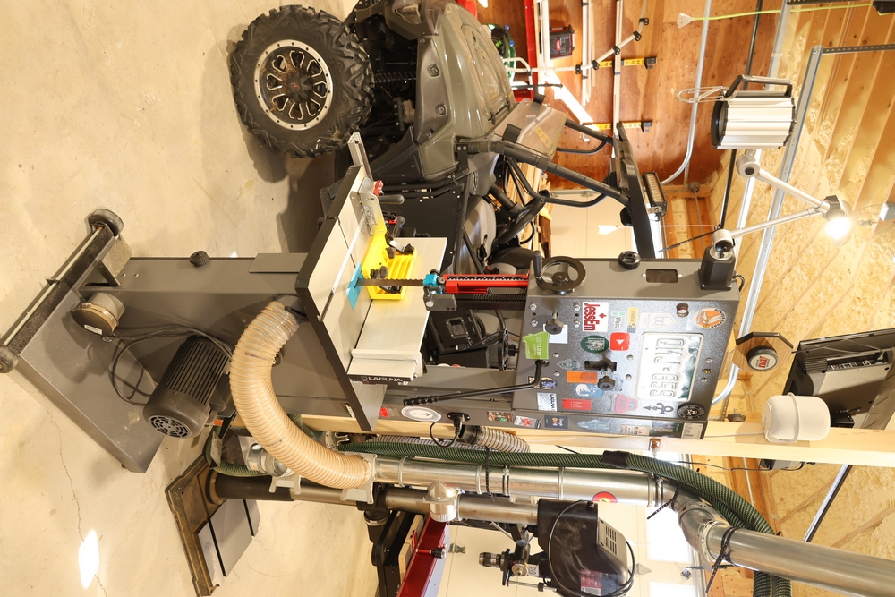 Bridge City Tool Works Jointmaker Pro Signature Series machine, mounted on a freestanding metal stand, featuring anodized aluminum tables, dual fence assemblies with integrated scales, angle adjustment arc, and multiple clamping and positioning components as shown. No equipment is onsite to assit loading. Bring the proper tools, equipment, and help needed to load your items.