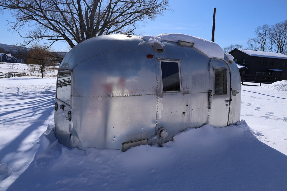 An Airstream Caravel single-axle travel trailer with aluminum body, exterior Airstream and Caravel badging, multiple side windows, front and rear windows, and a front hitch assembly, with the VIN shown on the data plate as J0175579. Snow will be cleared to machine prior to pickup. No equipment is onsite to assit loading. Bring the proper tools, equipment, and help needed to load your items. Bill of sale only.