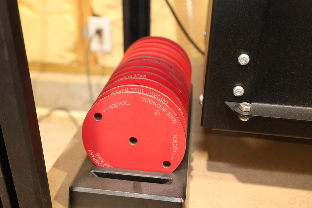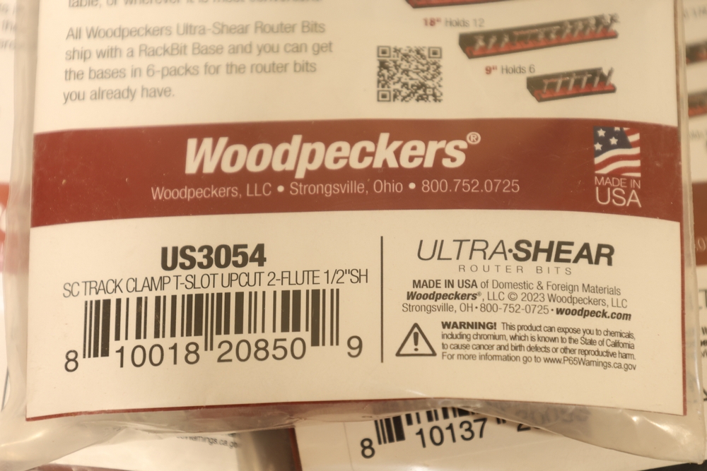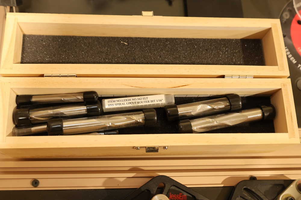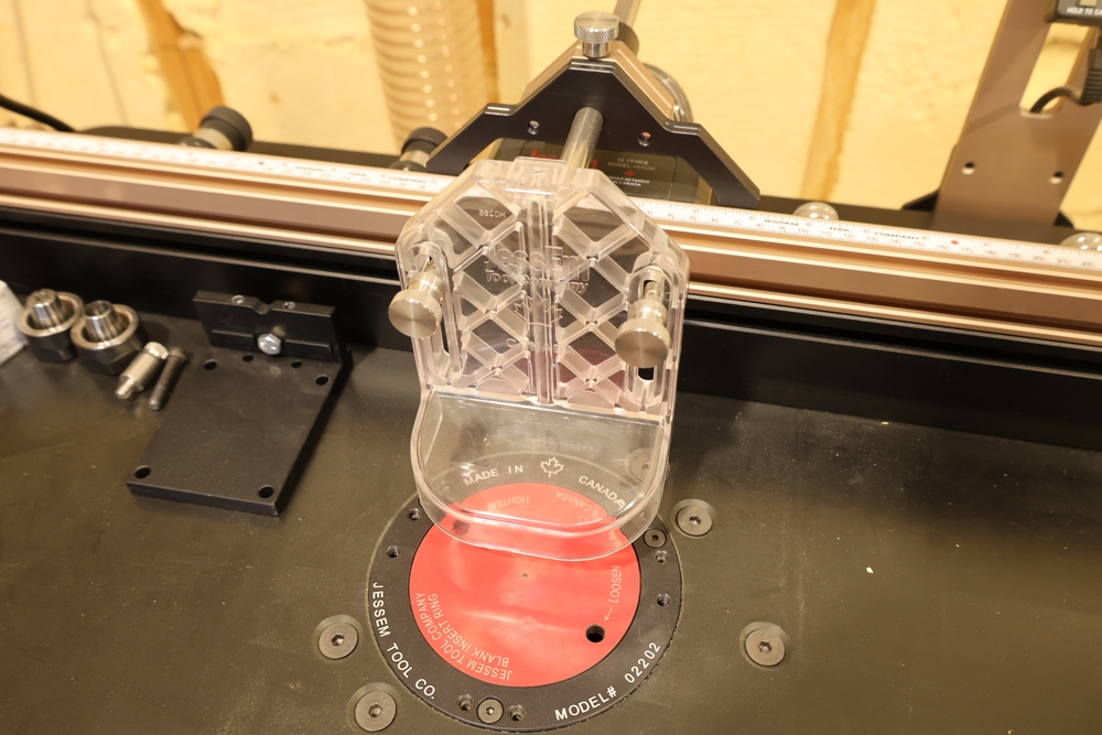 JessEm router table mounted on a wheeled steel stand, equipped with a JessEm fence assembly, clear guard, miter slot, and dust collection port, with a digital readout mounted to the fence. Also included are assorted router accessories and tooling shown, including JessEm and Woodpeckers components, router bits in cases and packaging from manufacturers such as Woodpeckers, Whiteside, Bosch, and Festool, bit storage items, collets, setup tools, and related hardware. Buyer is responsible for removal to the first disconnect. Excludes dust collection ductwork. No equipment is onsite to assit loading. Bring the proper tools, equipment, and help needed to load your items.