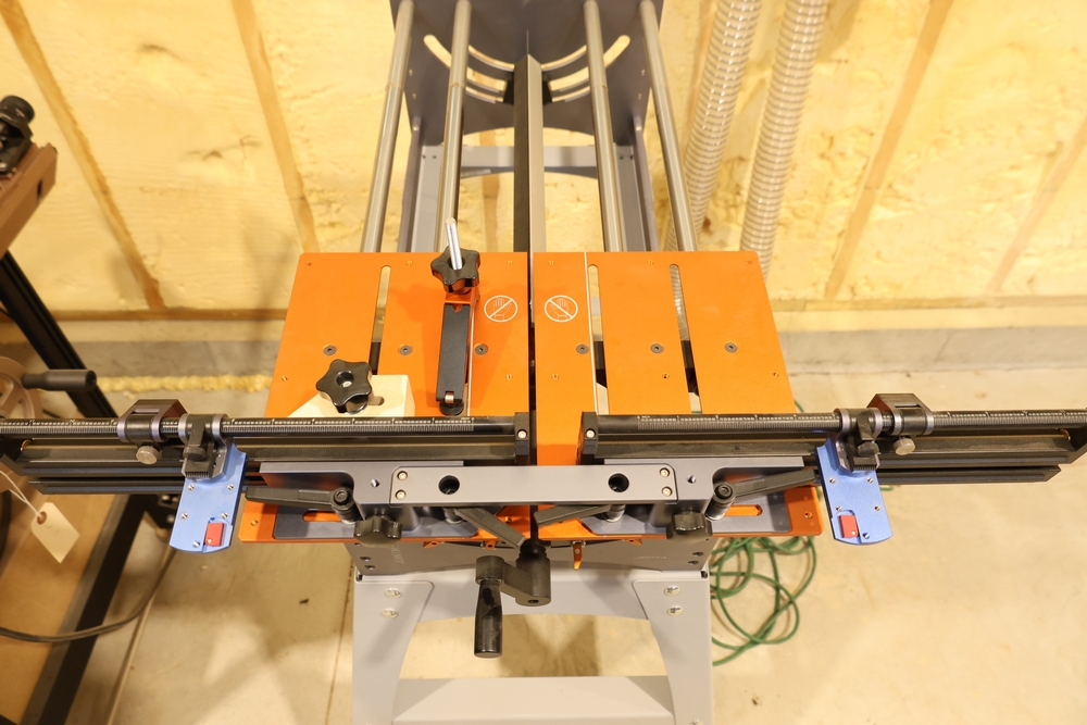 Bridge City Tool Works Jointmaker Pro Signature Series machine, mounted on a freestanding metal stand, featuring anodized aluminum tables, dual fence assemblies with integrated scales, angle adjustment arc, and multiple clamping and positioning components as shown. No equipment is onsite to assit loading. Bring the proper tools, equipment, and help needed to load your items.